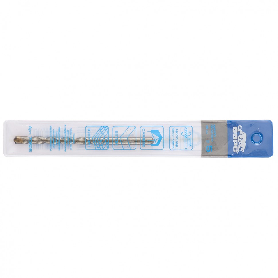 Сверло по бетону Барс Carbide TIP 70525 диаметром 5 мм и длиной 85 мм, с цилиндрическим хвостовиком, предназначено для получения отверстий в камне и бетоне. Изготовлено из стали 40Х, легированной хромом, и выдерживает высокие динамические нагрузки. Его можно использовать с дрелью или шуруповертом, работающими в ударном режиме. Сверло обладает наивысшим ресурсом среди аналогичных моделей конкурентов, пригодится во время строительных и ремонтных работ.