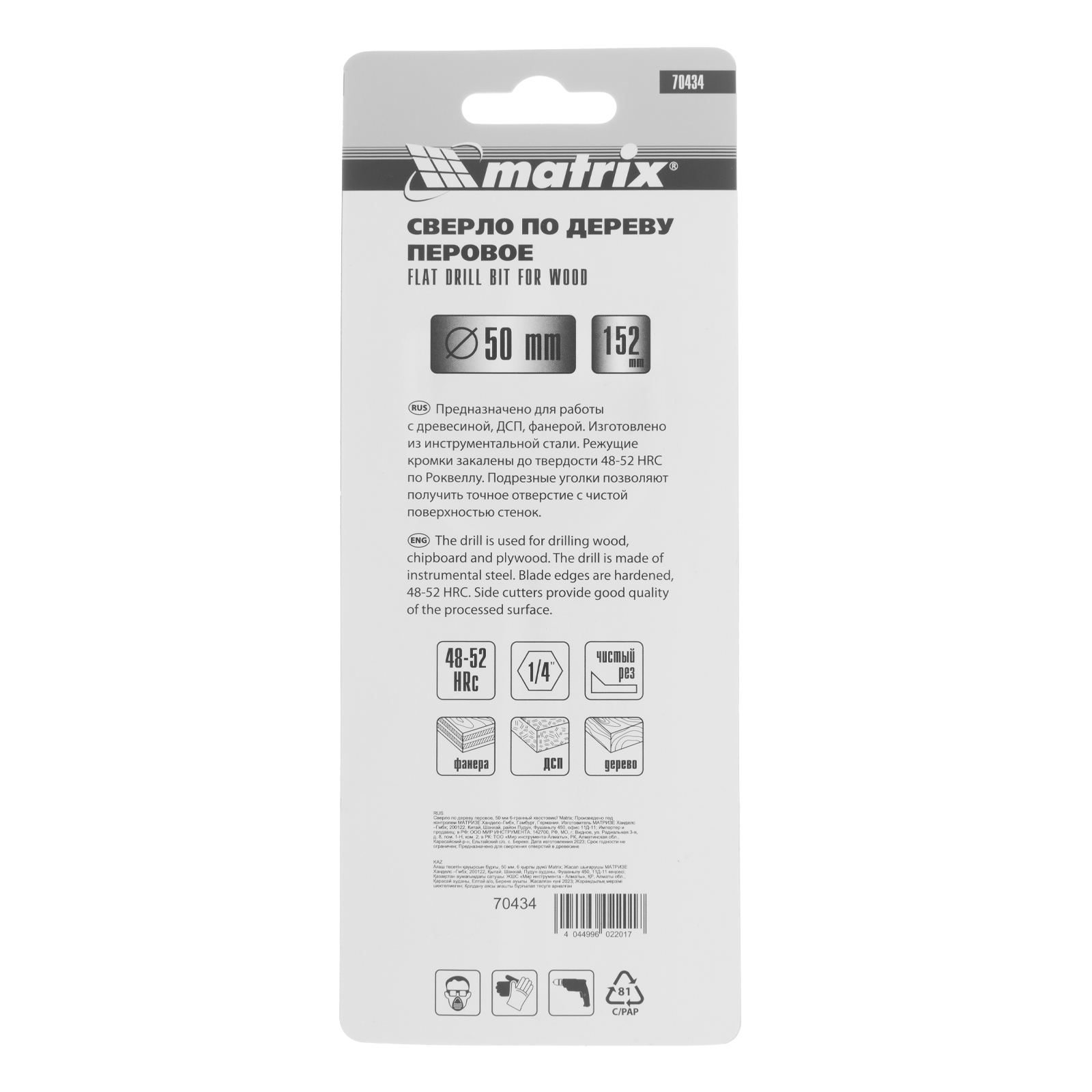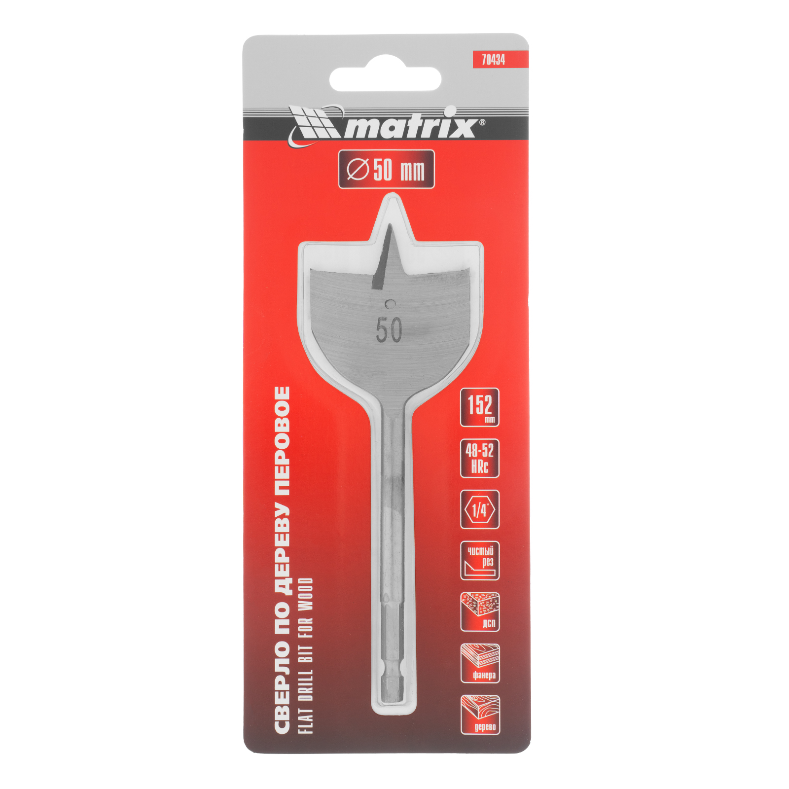 Сверло по дереву перовое, 50 мм, шестигранный хвостовик Matrix