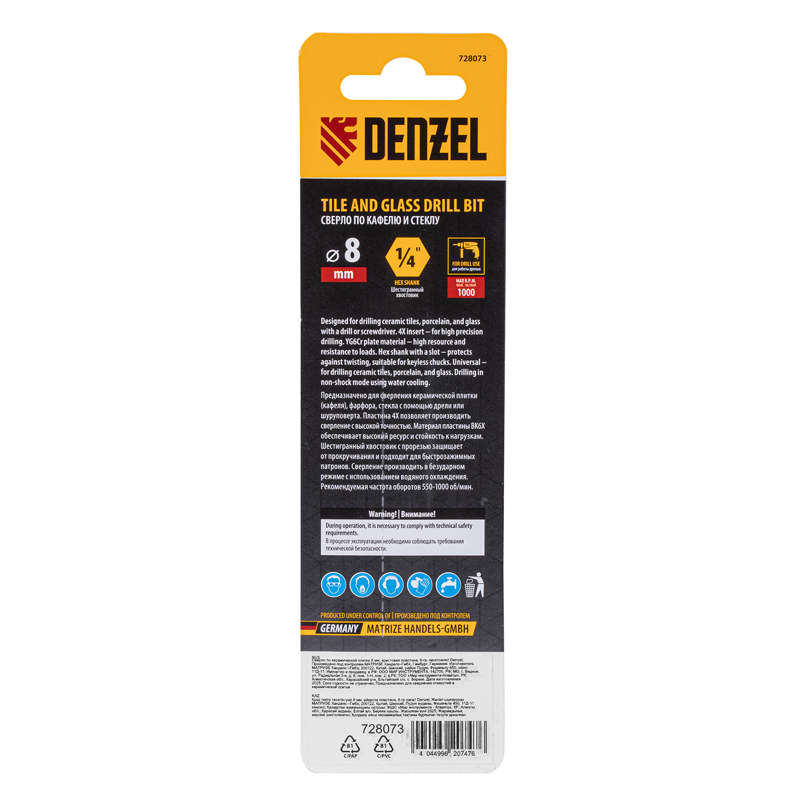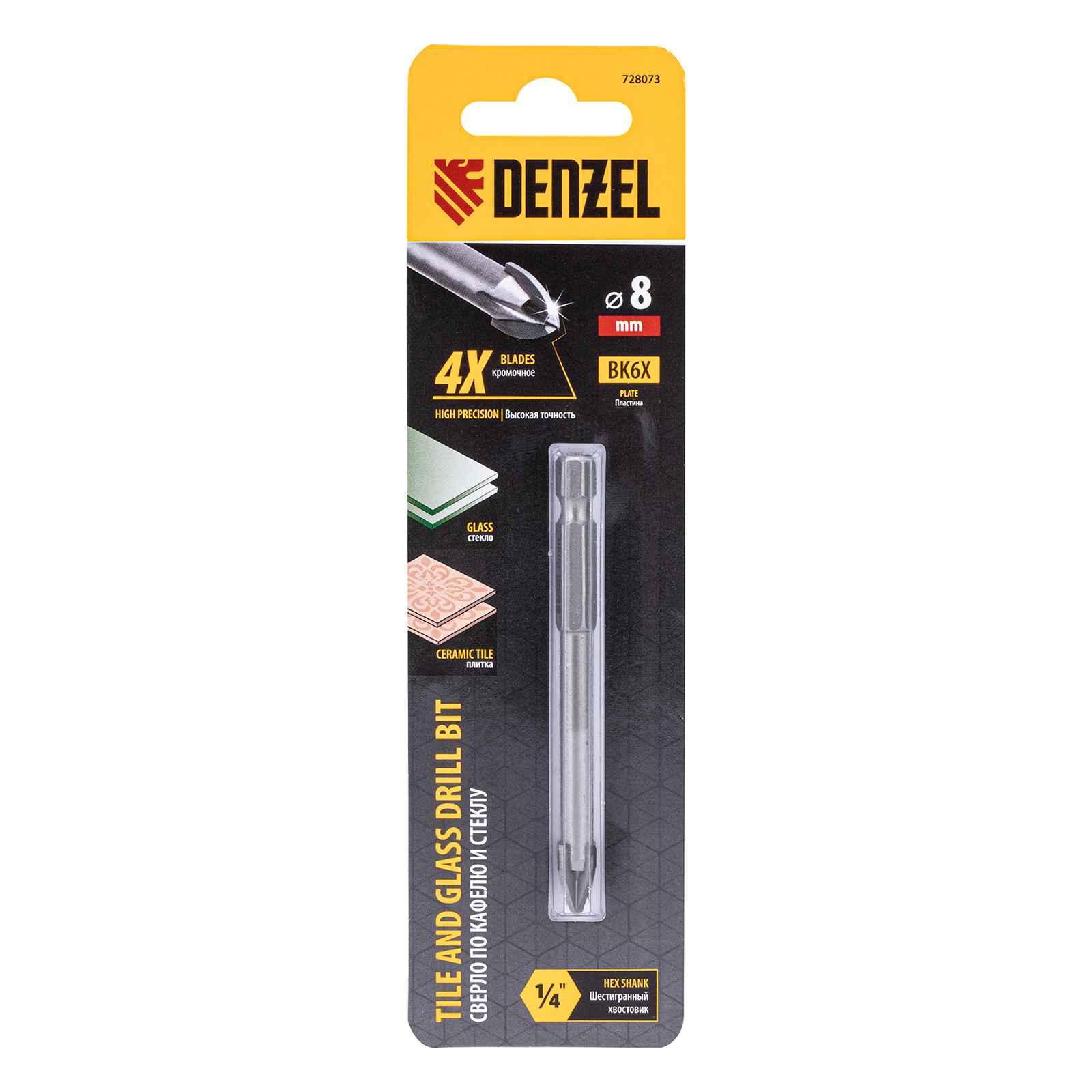 Сверло по керамической плитке 8 мм, крестовая пластина, шестигранный хвостовик// Denzel