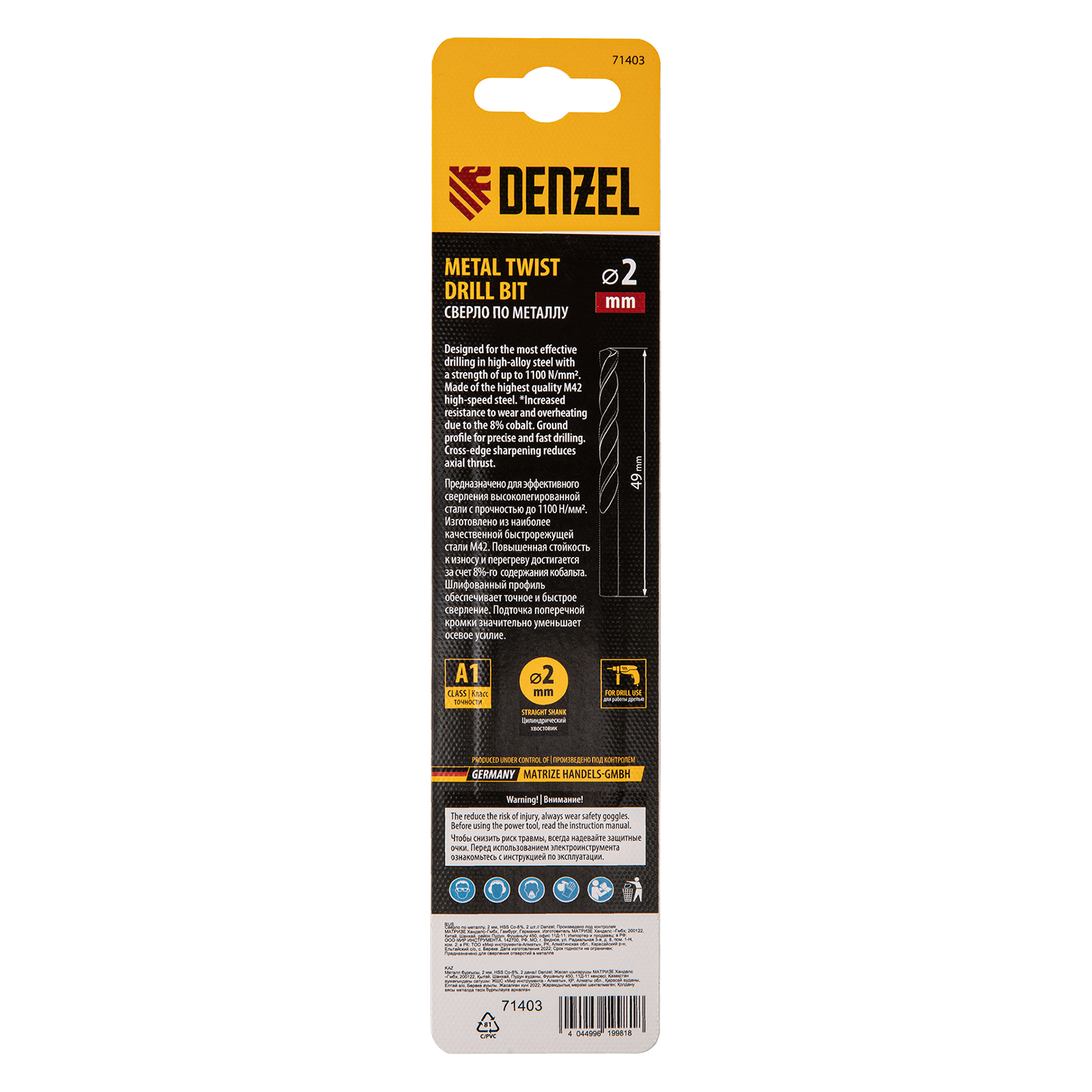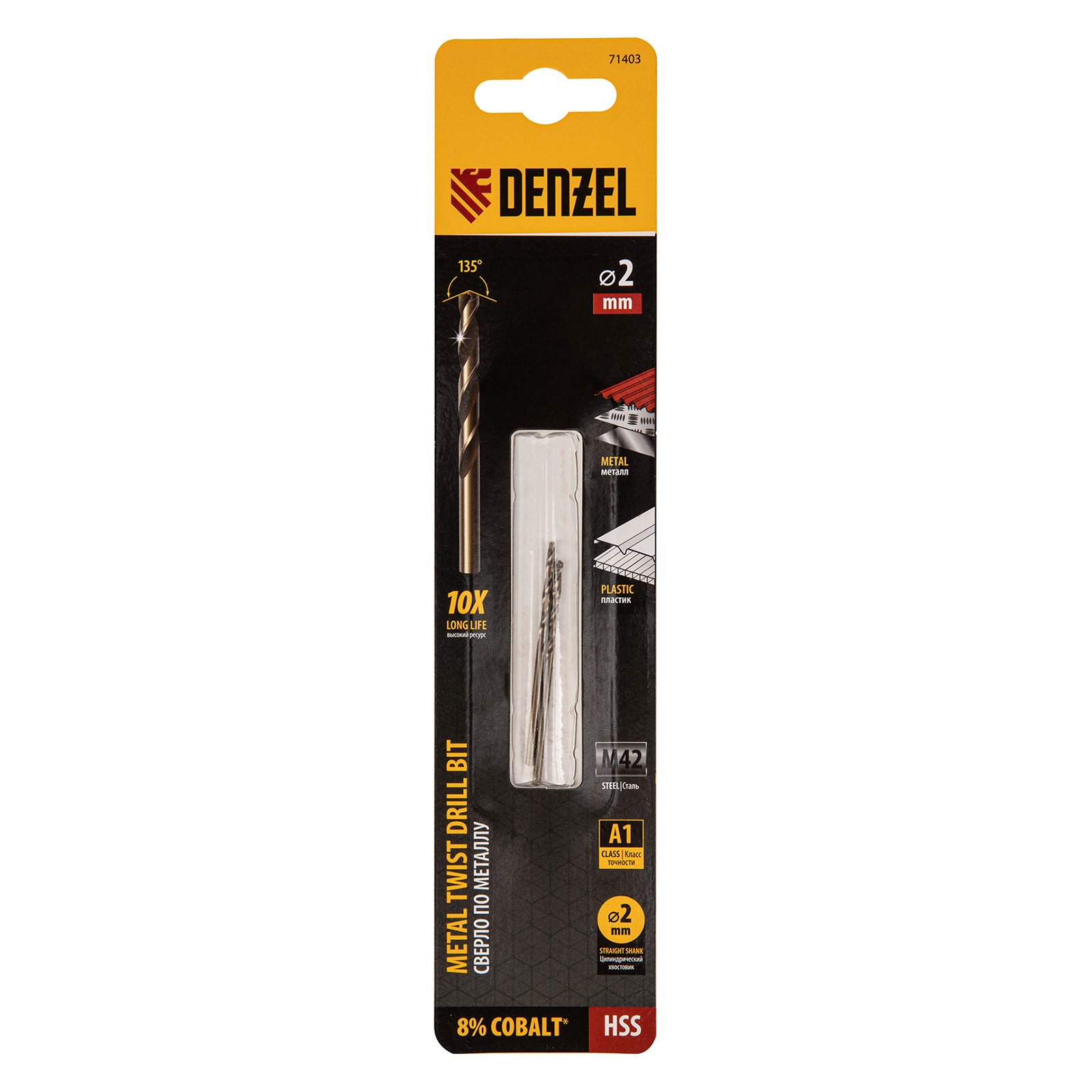 Кобальтовое сверло по металлу Denzel 71403 диаметром 2 мм, из стали HSS Co-8%, 2 шт. в упаковке, позволяет получать отверстия высокой точности в нержавеющей стали, цветных металлах, легированных и нелегированных сталях с пределом прочности до 1100 Н/мм2, а также в жестком пластике. Угол заточки 135° обеспечивает повышенную точность и чистоту сверления.