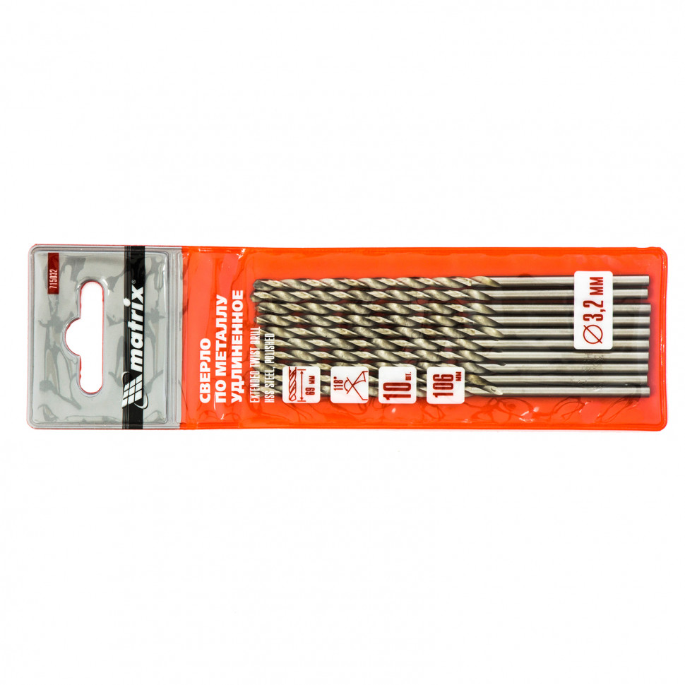 Полированное удлиненное сверло по металлу Matrix 715032 размером 3,2 х 106 мм, из стали HSS, с цилиндрическим хвостовиком, 10 шт. в упаковке, благодаря удлиненному профилю подходит для глубокого сверления. Угол заточки сверл составляет 118° и является оптимальным для работы с черными металлами, сталью, чугуном и твердой бронзой.
