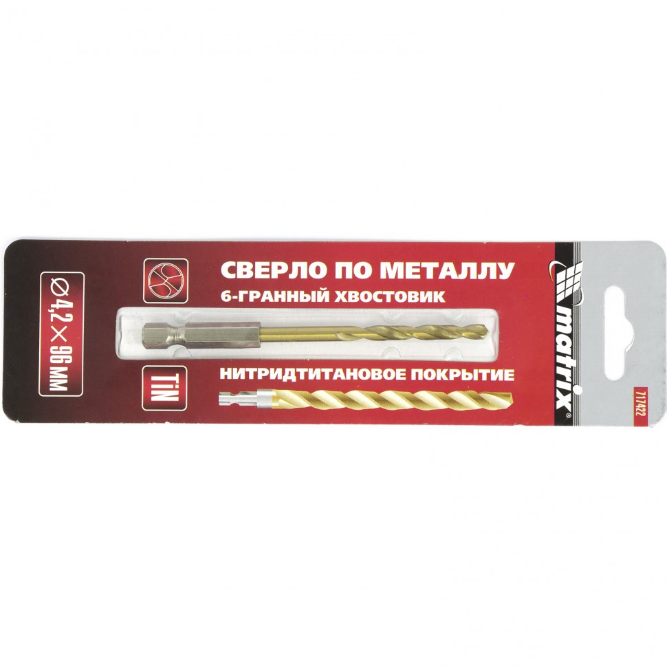 Сверло по металлу Matrix 717422 диаметром 4,2 мм, из стали HSS, с нитридтитановым покрытием и 6-гранным хвостовиком, предназначено для получения отверстий в черном металле, стали, чугуне и твердой бронзе. Устанавливается в патрон дрели.
