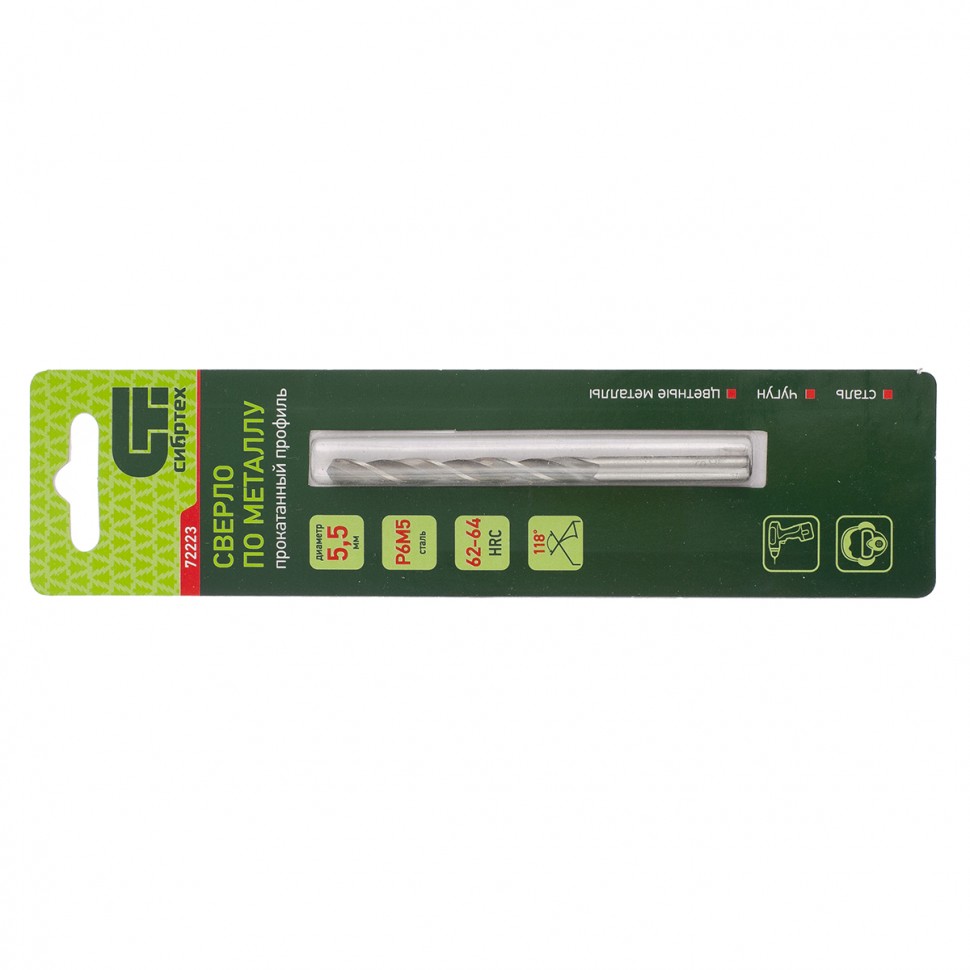 Сверло по металлу Сибртех 72223 диаметром 5,5 мм, имеет угол заточки 118°, оптимальный для получения отверстий в черных и тяжелых металлах, в том числе стали, чугуне и твердой бронзе. Отличается наиболее выгодной стоимостью по сравнению с другими моделями из стали P6M5. Используется для выполнения монтажно-сборочных работ, будет полезно в быту.