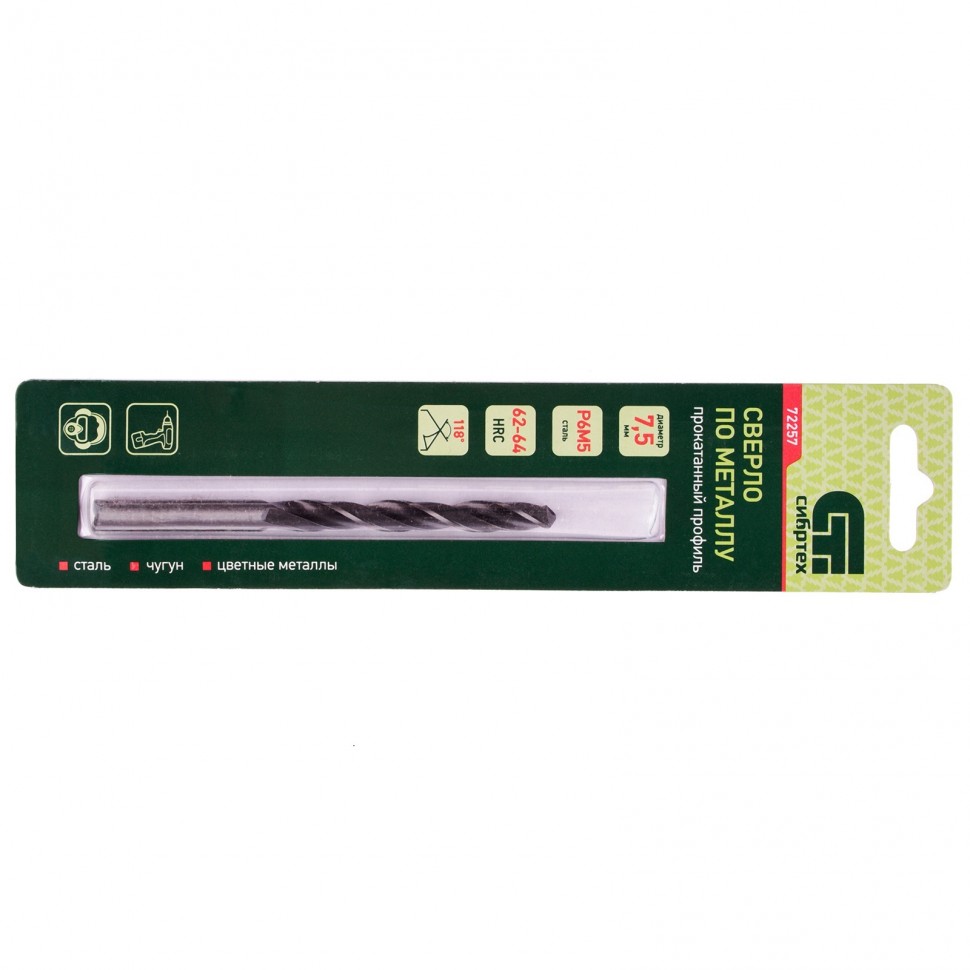 Сверло по металлу Сибртех 72257 диаметром 7,5 мм, имеет угол заточки 118°, оптимальный для получения отверстий в черных и тяжелых металлах, в том числе стали, чугуне и твердой бронзе. Отличается наиболее выгодной стоимостью по сравнению с другими моделями из стали P6M5. Используется для выполнения монтажно-сборочных работ, будет полезно в быту.
