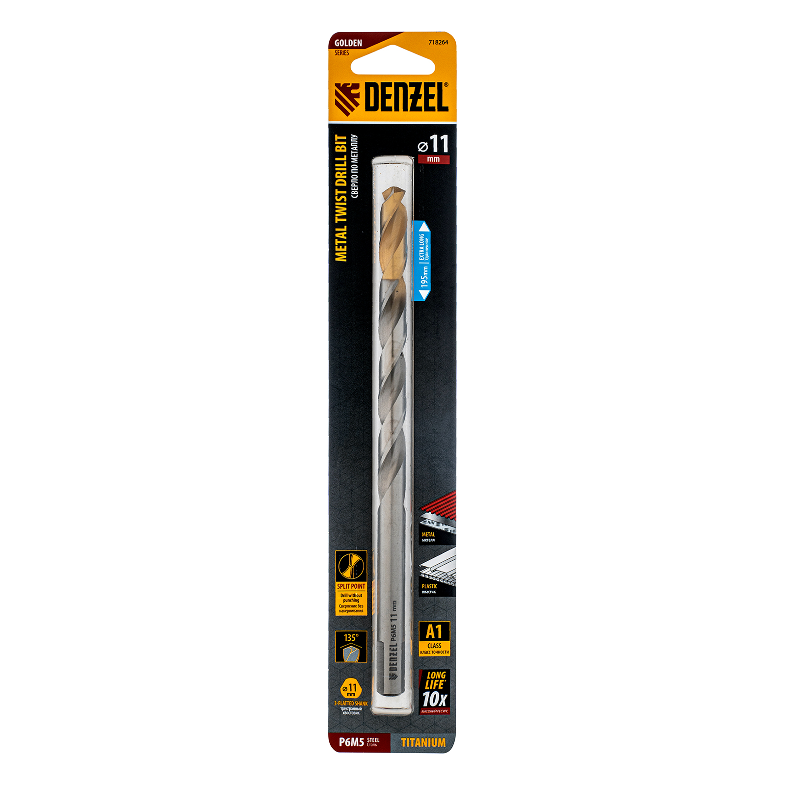 Удлиненное спиральное сверло по металлу Denzel Golden Tip 718264 из стали P6M5, размером 11 х 195 мм, предназначено для получения отверстий в легированных и цветных металлах — меди, алюминии, мягкой бронзе, титане, латуни. Оснастка позволяет эффективно справляться с этими задачами благодаря оптимальному углу заточки 135°. Класс точности A гарантирует высокое качество работ, а удлиненный профиль позволяет сверлить глубокие отверстия. Сверло используется для проведения монтажно-сборочных работ.