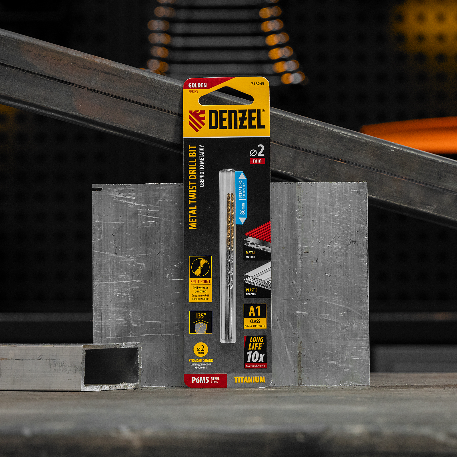 Удлиненное спиральное сверло по металлу Denzel Golden Tip 718245 из стали P6M5, размером 2 х 86 мм, 2 шт. в упаковке, предназначено для получения отверстий в легированных и цветных металлах — меди, алюминии, мягкой бронзе, титане, латуни. Оснастка позволяет эффективно справляться с этими задачами благодаря оптимальному углу заточки 135°. Класс точности A гарантирует высокое качество работ, а удлиненный профиль позволяет сверлить глубокие отверстия. Сверло используется для проведения монтажно-сборочных работ.