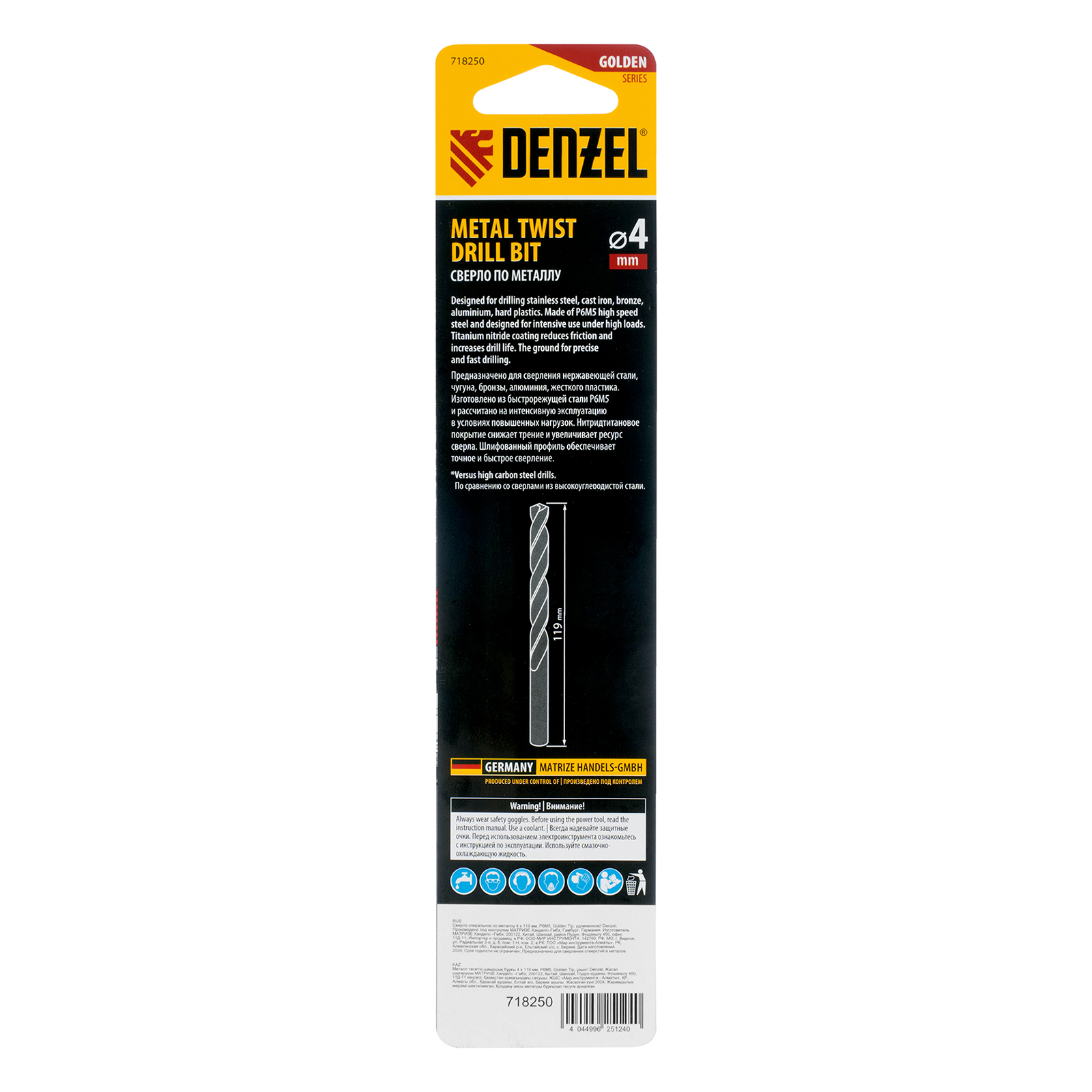 Сверло спиральное по металлу 4 х 119 мм, Р6М5, Golden Tip, удлиненное Denzel