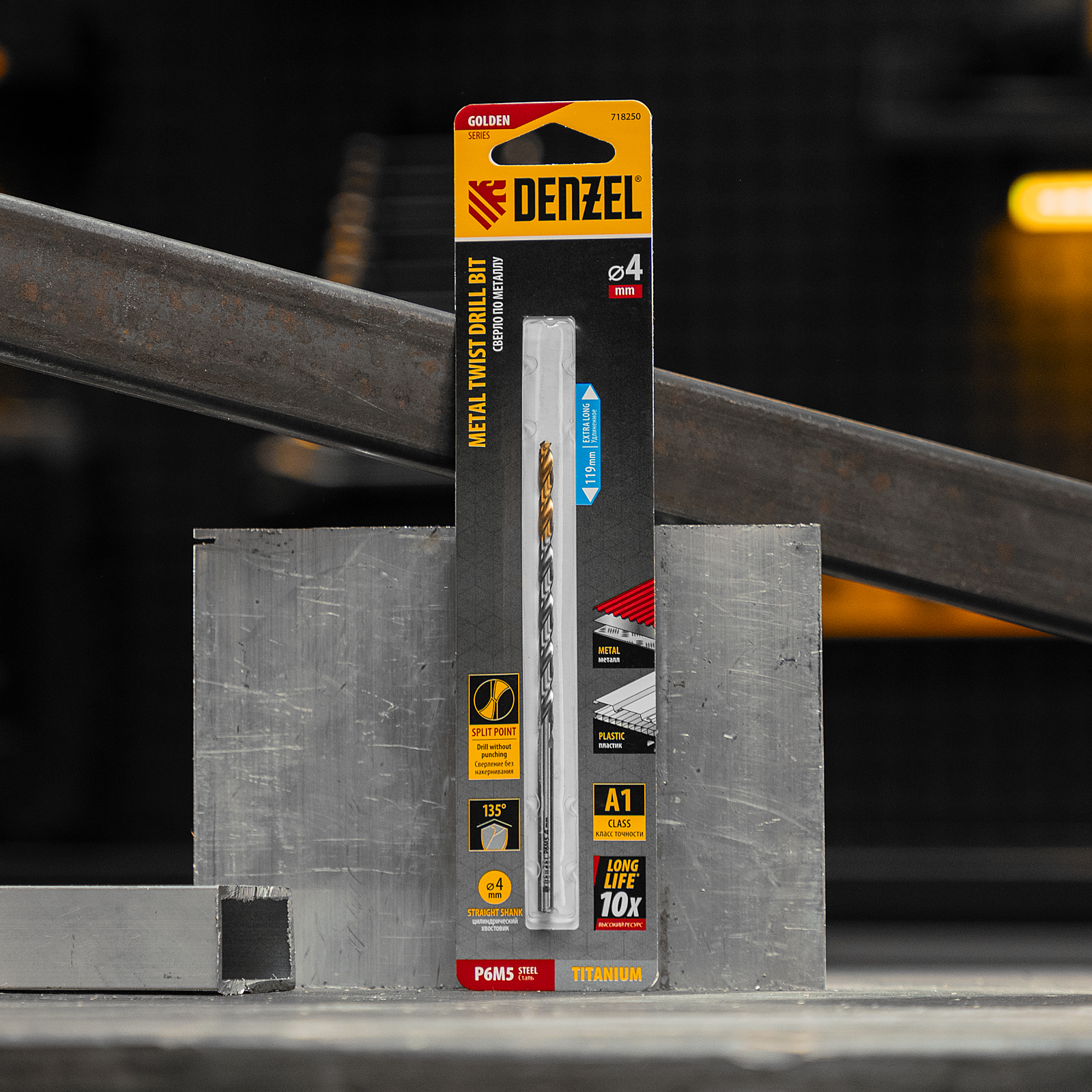 Удлиненное спиральное сверло по металлу Denzel Golden Tip 718250 из стали P6M5, размером 4 х 119 мм, предназначено для получения отверстий в легированных и цветных металлах — меди, алюминии, мягкой бронзе, титане, латуни. Оснастка позволяет эффективно справляться с этими задачами благодаря оптимальному углу заточки 135°. Класс точности A гарантирует высокое качество работ, а удлиненный профиль позволяет сверлить глубокие отверстия. Сверло используется для проведения монтажно-сборочных работ.