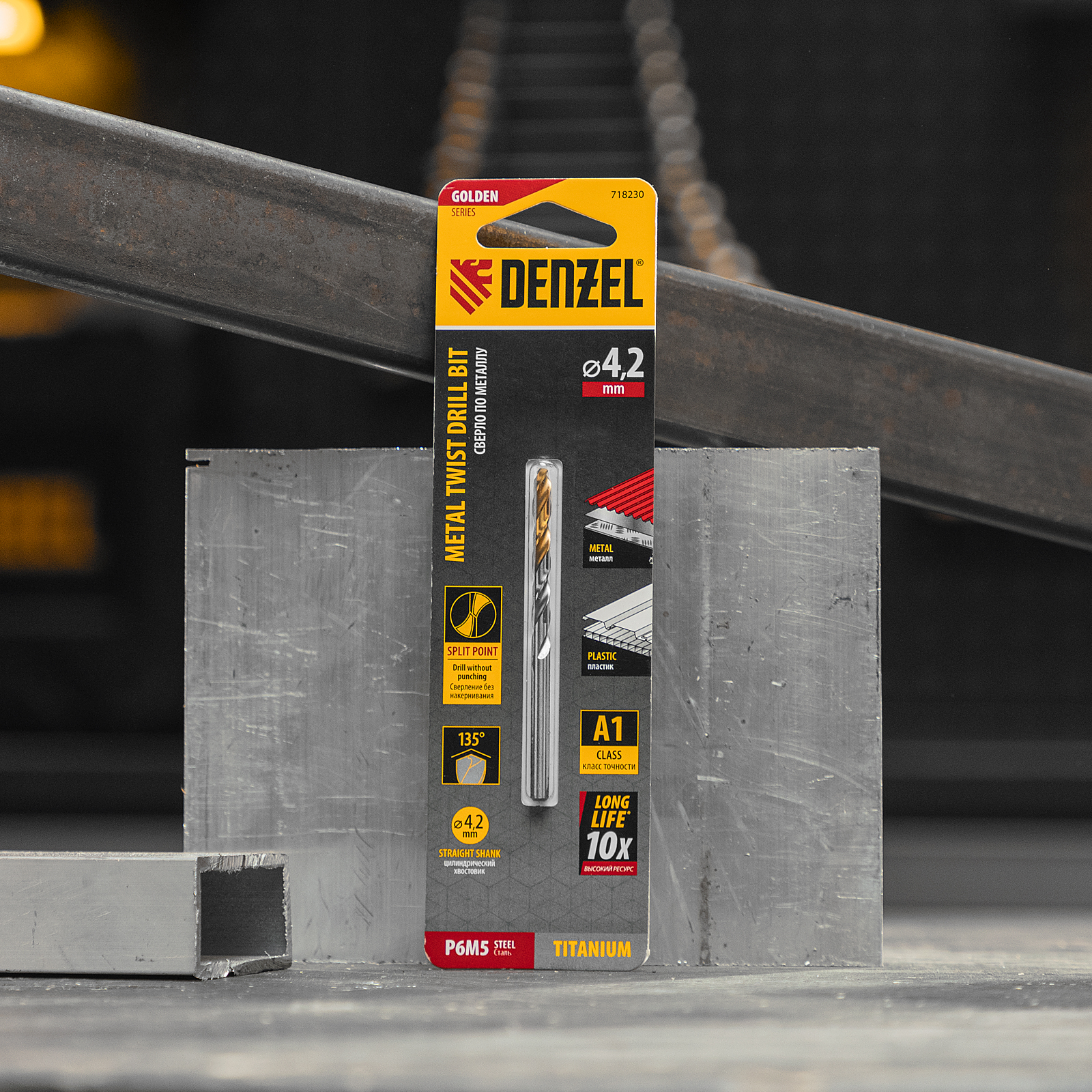 Спиральное сверло по металлу Denzel Golden Tip 718230 из стали P6M5, размером 4,2 х 75 мм, предназначено для получения отверстий в легированных и цветных металлах — меди, алюминии, мягкой бронзе, титане, латуни. Оснастка позволяет эффективно справляться с поставленными задачами благодаря оптимальному углу заточки 135°. Класс точности A гарантирует высокое качество полученных отверстий. Сверло используется для проведения монтажно-сборочных работ.