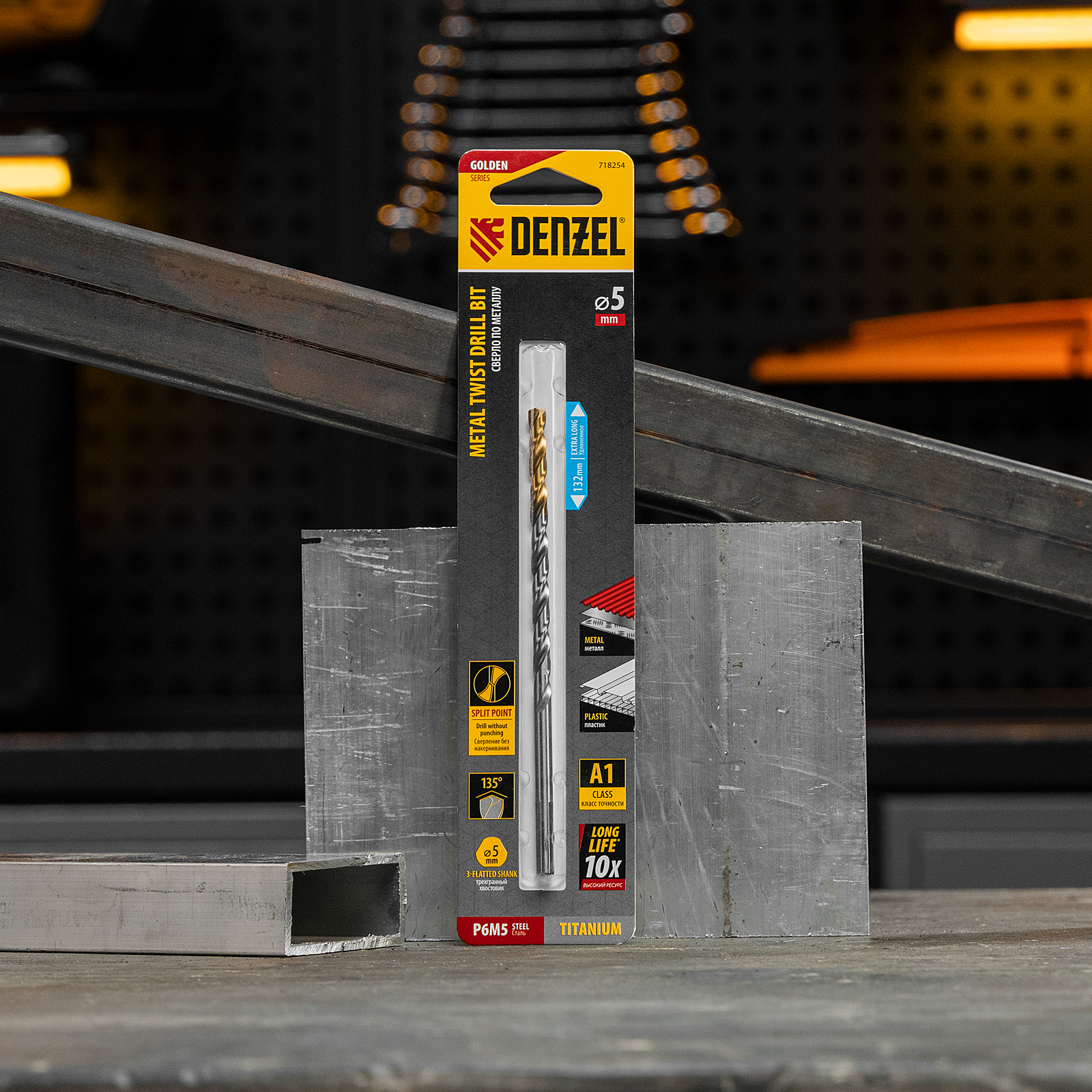 Удлиненное спиральное сверло по металлу Denzel Golden Tip 718254 из стали P6M5, размером 5 х 132 мм, предназначено для получения отверстий в легированных и цветных металлах — меди, алюминии, мягкой бронзе, титане, латуни. Оснастка позволяет эффективно справляться с этими задачами благодаря оптимальному углу заточки 135°. Класс точности A гарантирует высокое качество работ, а удлиненный профиль позволяет сверлить глубокие отверстия. Сверло используется для проведения монтажно-сборочных работ.