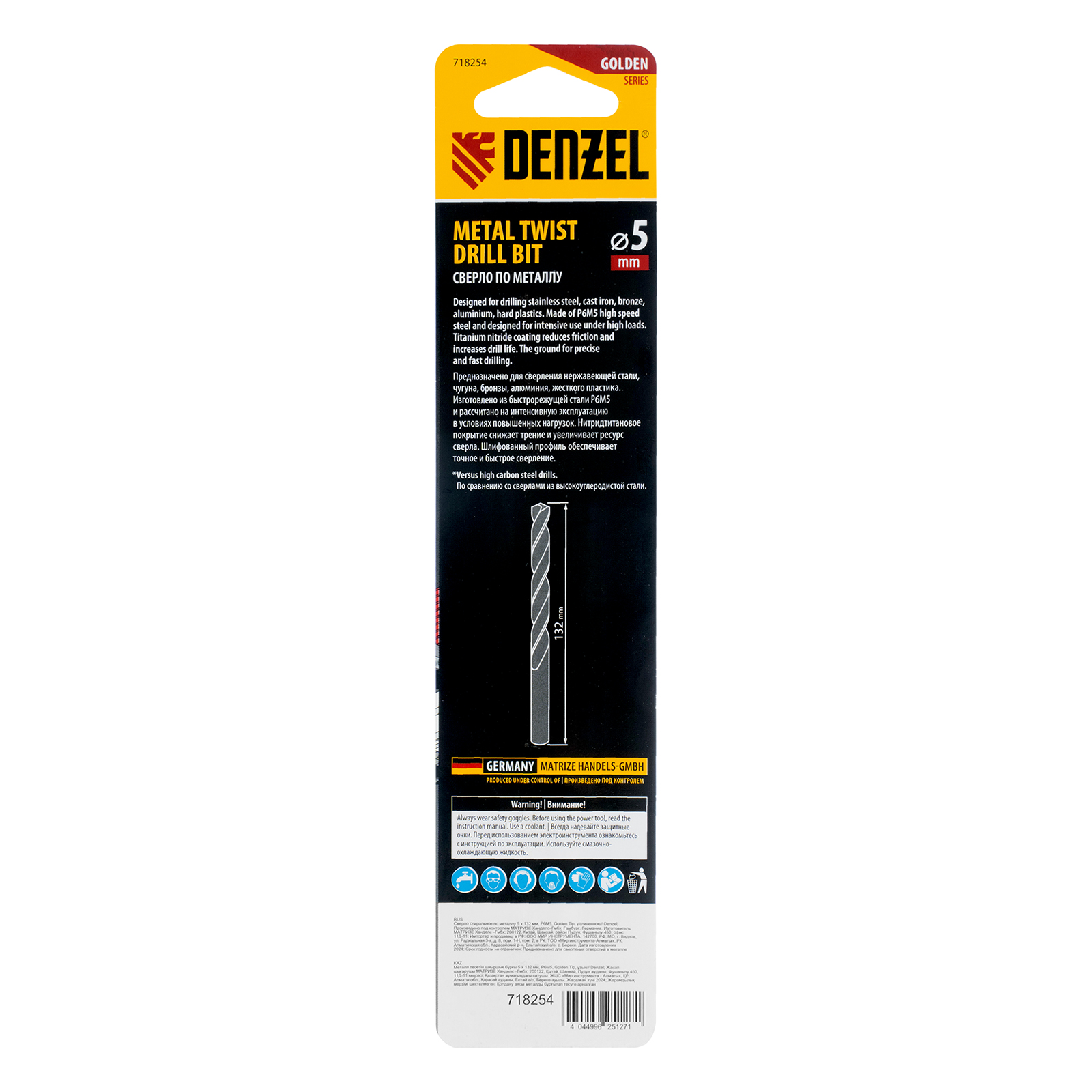 Сверло спиральное по металлу 5 х 132 мм, Р6М5, Golden Tip, удлиненное Denzel