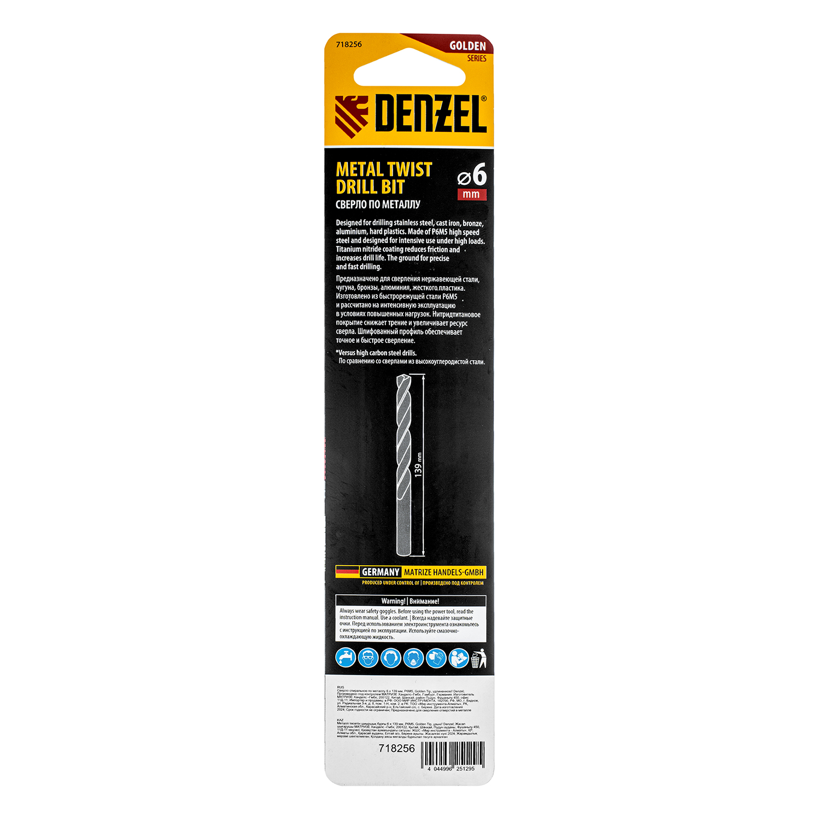 Сверло спиральное по металлу 6 х 139 мм, Р6М5, Golden Tip, удлиненное Denzel