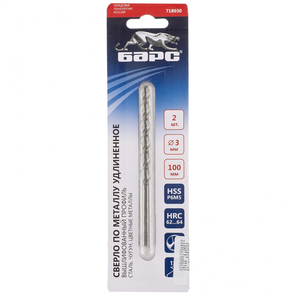 Удлиненное спиральное сверло по металлу Барс 718030 диаметром 3 мм и длиной 100 мм, из стали P6M5, 2 шт. в упаковке, имеет угол заточки 135° и используется для получения отверстий в легированных и цветных металлах: алюминии, мягкой бронзе, титане, меди, латуни. Имеет класс точности A, что обеспечивает высокое качество проводимых работ. Сверло из высококачественной быстрорежущей стали твердостью 62-64 HRC устойчиво к перегреву и динамическим нагрузкам. Удлиненный профиль позволяет сверлить глубокие отверстия. Сверло используется для монтажно-сборочных работ.