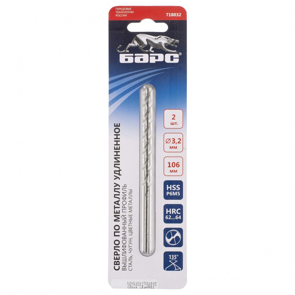 Сверло спиральное по металлу, 3.2 х 106 мм, Р6М5, удлиненное, 2 шт Барс