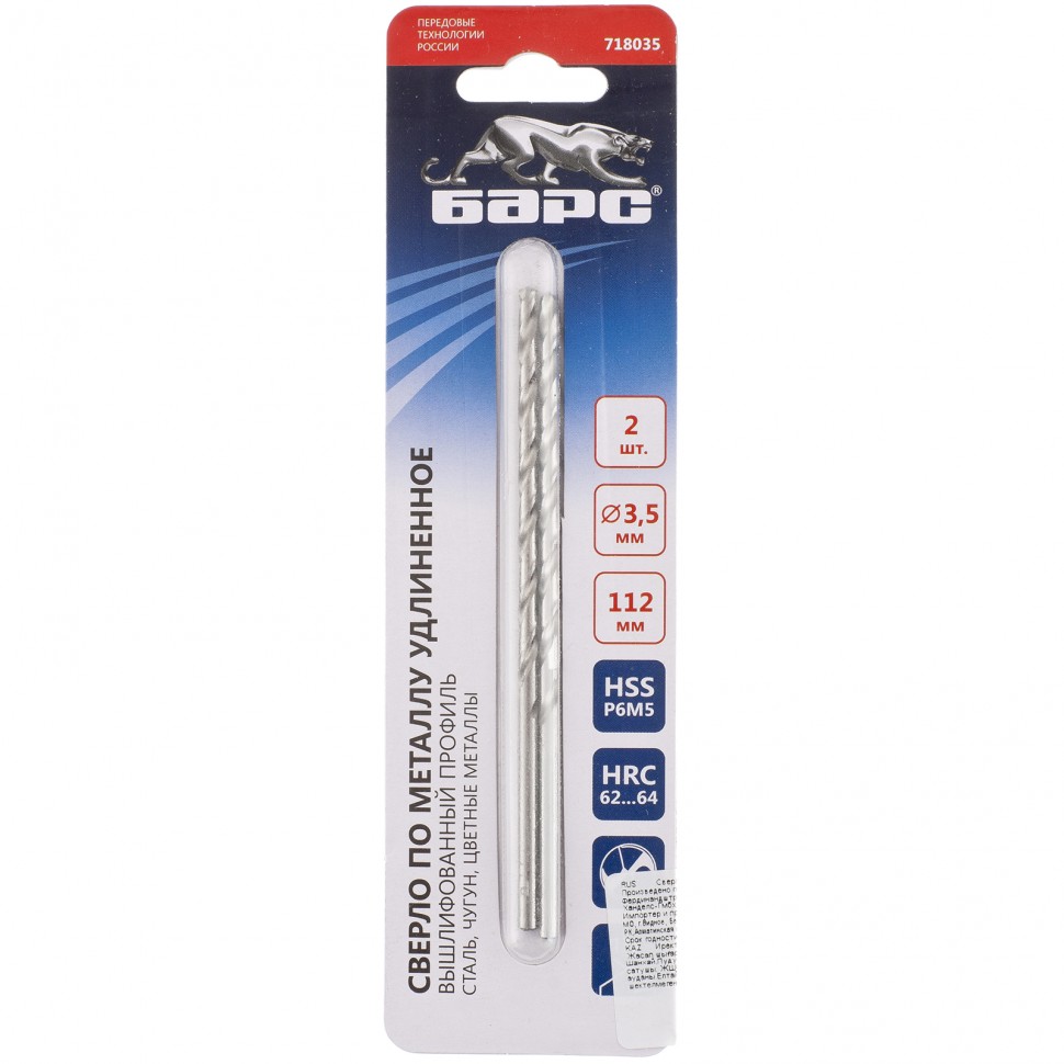 Сверло спиральное по металлу, 3.5 х 112 мм, Р6М5, удлиненное, 2 шт Барс