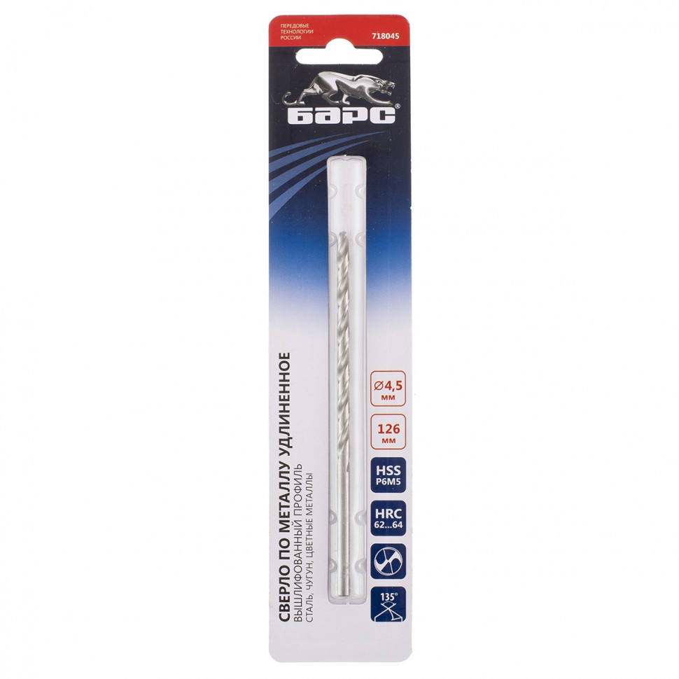 Сверло спиральное по металлу, 4.5 х 126 мм, Р6М5, удлиненное Барс