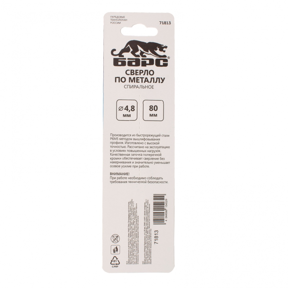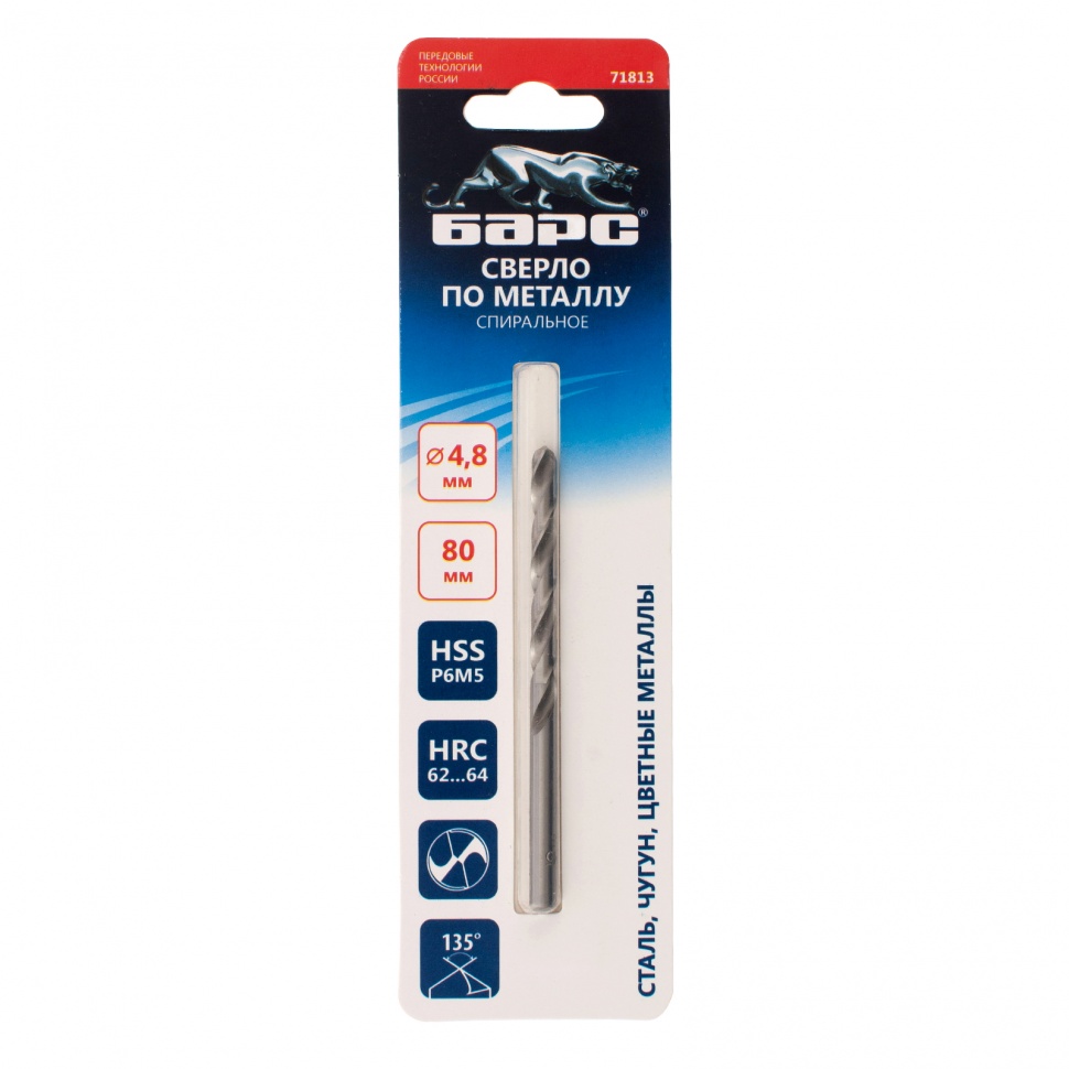 Сверло спиральное по металлу, 4.8 x 80 мм, Р6М5 Барс