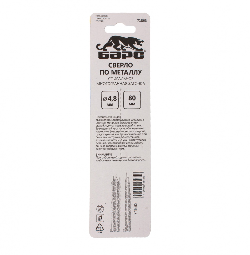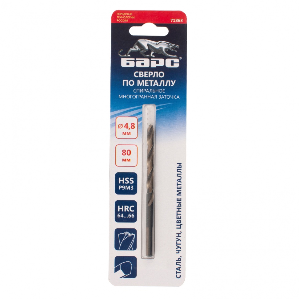 Спиральное сверло по металлу Барс 71863 из стали P9M3, диаметром 4,8 мм и длиной 86 мм, с многогранной заточкой, предназначено для получения отверстий в легированных сталях и цветных металлах. Многогранная заточка позволяет получать чистые и ровные отверстия с минимальным заусенцем, класс точности A обеспечивает высокое качество выполняемых работ. Сверло используется в производственных и бытовых целях.