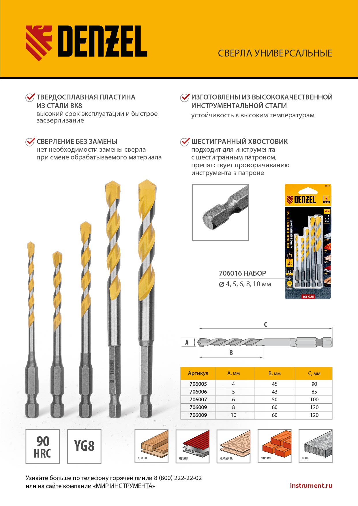 Универсальное сверло Denzel Multi Cut 706006 с шестигранным хвостовиком предназначено для получения отверстий диаметром 5 мм в бетоне, металле, керамике, древесине любых пород, фанере, пластмассе и других материалах. Используется при проведении строительных, ремонтных работ, также пригодится в быту.