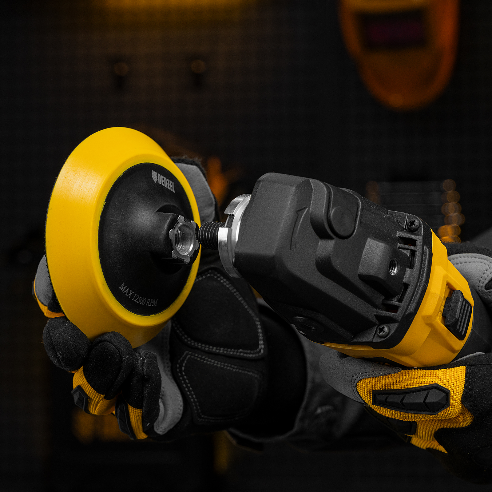 Тарелка опорная для дрели и УШМ с липучкой, 115 мм, мягкая, с адаптером c М14 на d8 Denzel