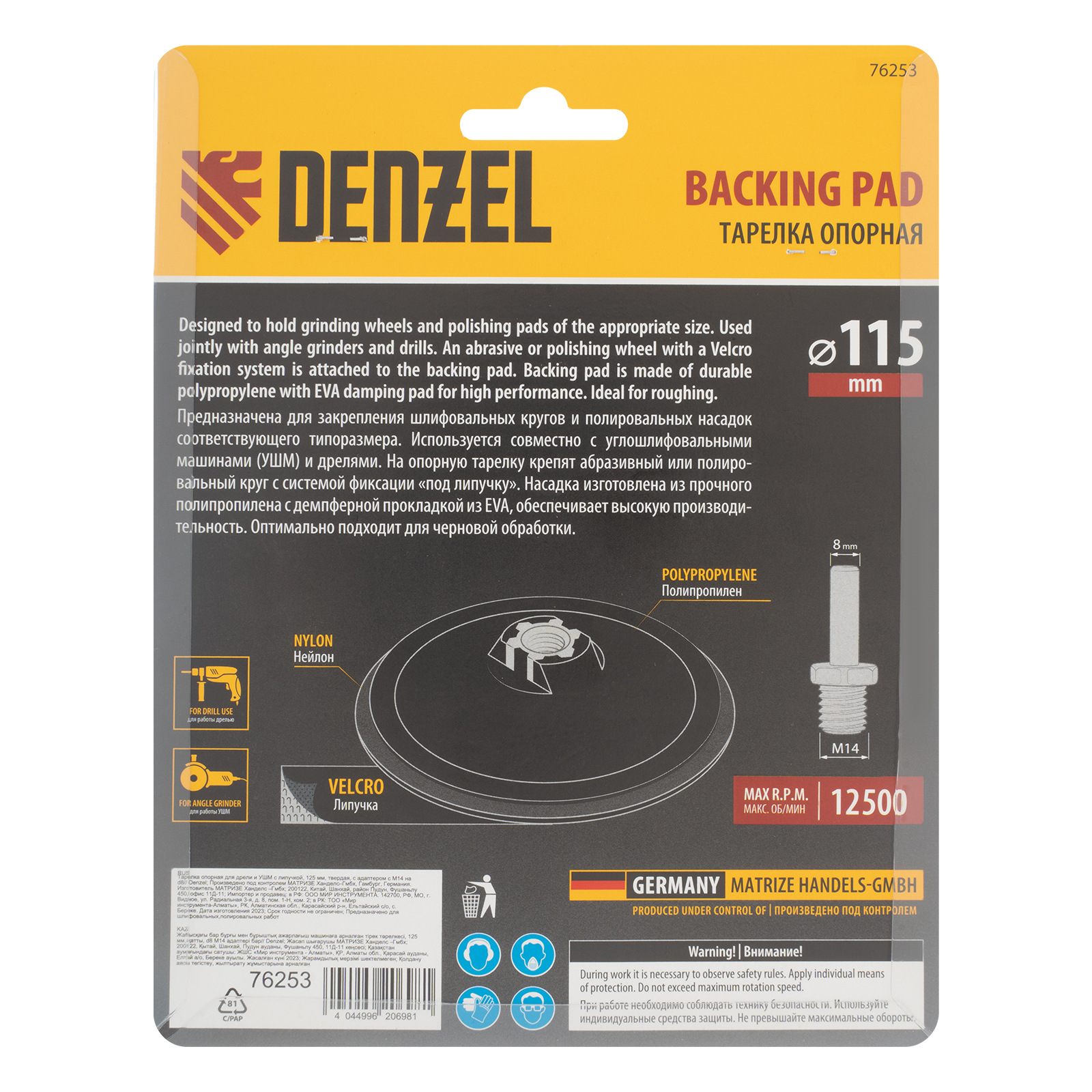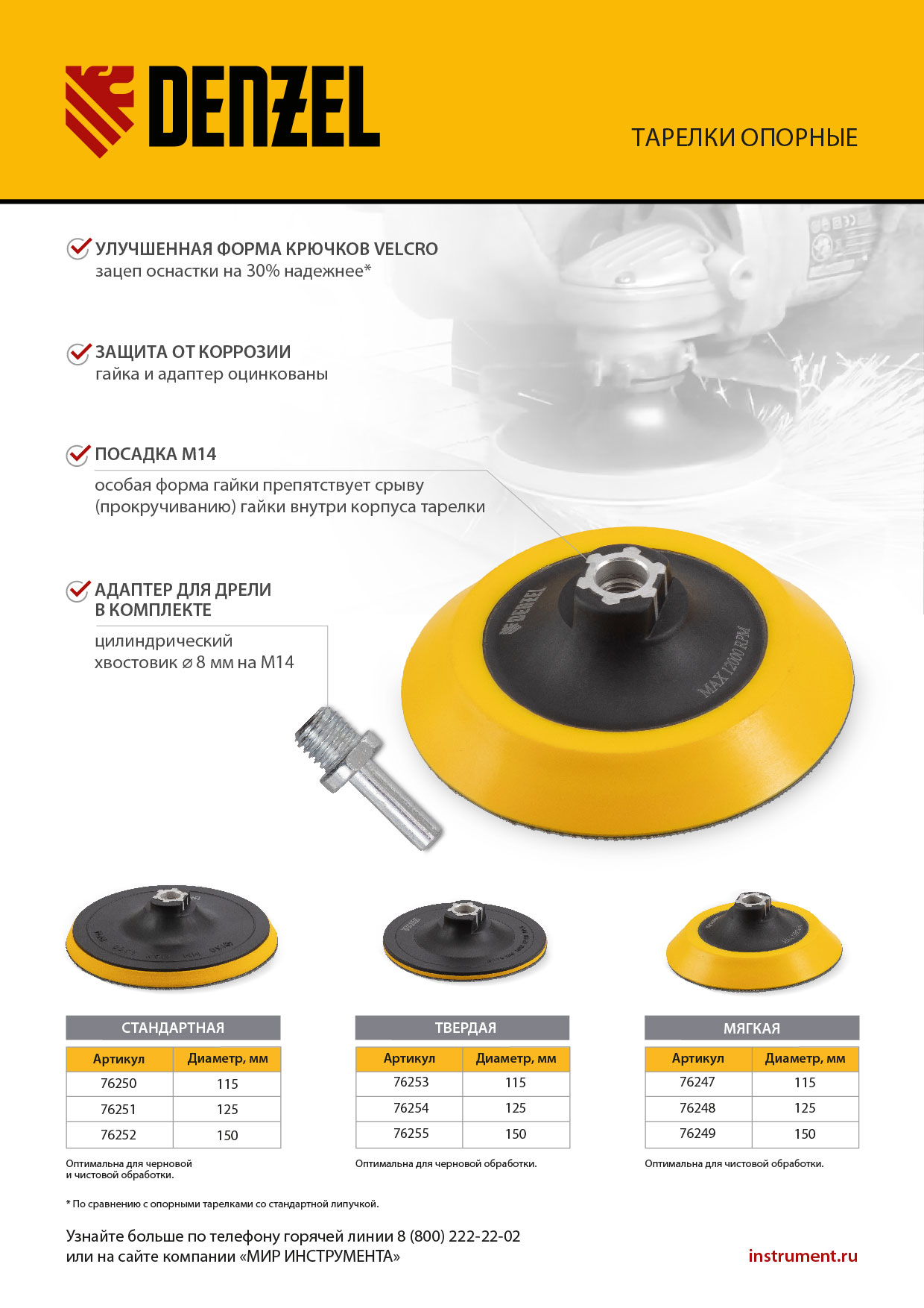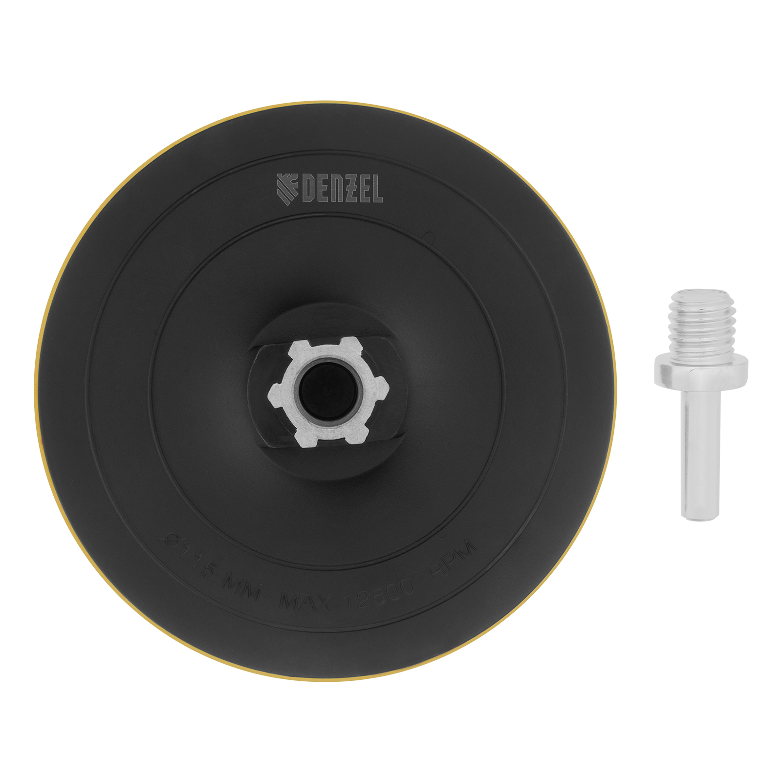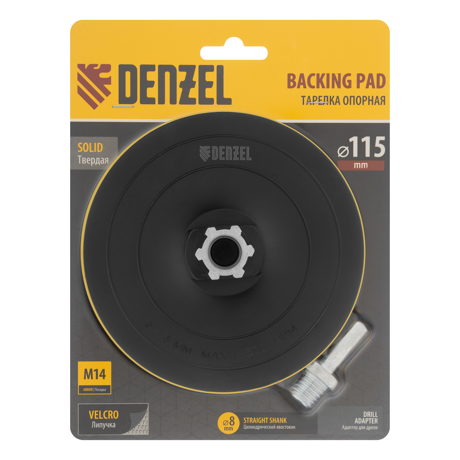 Тарелка опорная для дрели и УШМ с липучкой, 115 мм, твердая, с адаптером c М14 на d8 Denzel