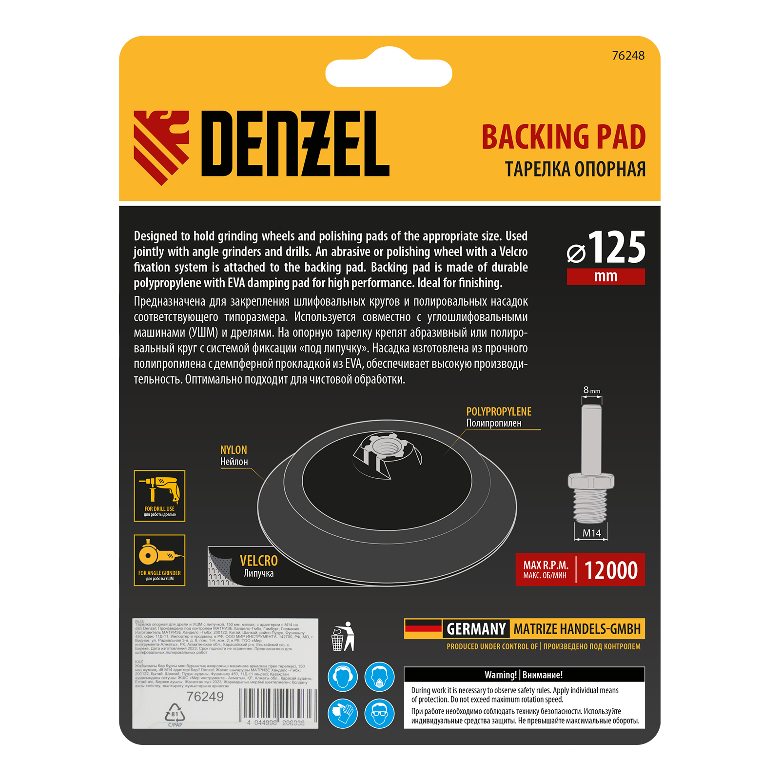 Тарелка опорная для дрели и УШМ с липучкой, 125 мм, мягкая, с адаптером c М14 на d8 Denzel
