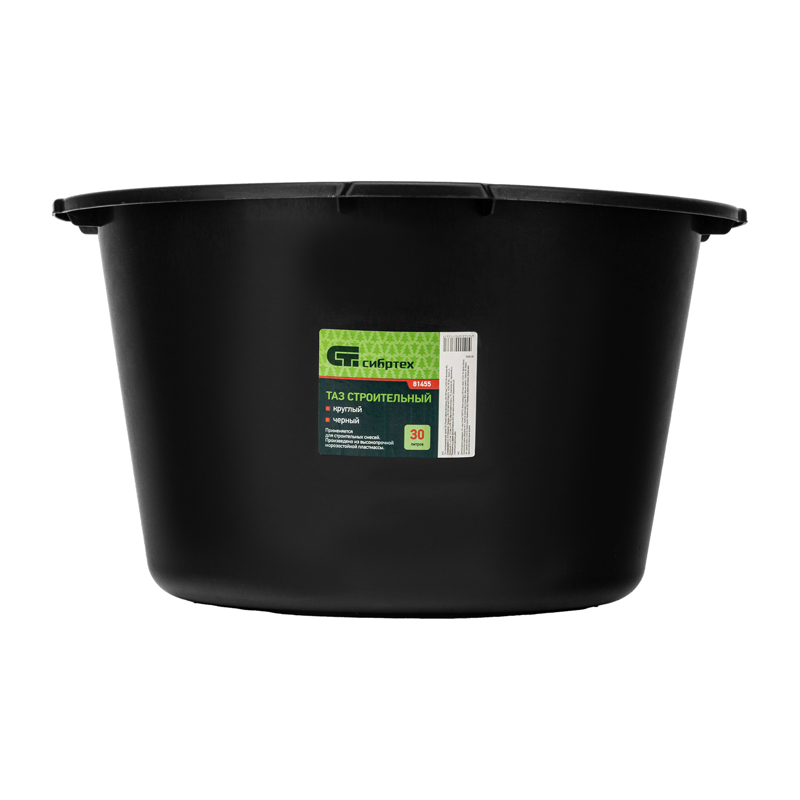 Круглый строительный таз Сибртех 81455 объемом 30 л, черного цвета, используется для приготовления штукатурных, шпаклевочных, красящих, клеевых растворов при проведении ремонтных и отделочных работ. Пригодится таз и в быту — в нем удобно хранить и перемещать сыпучие материалы.