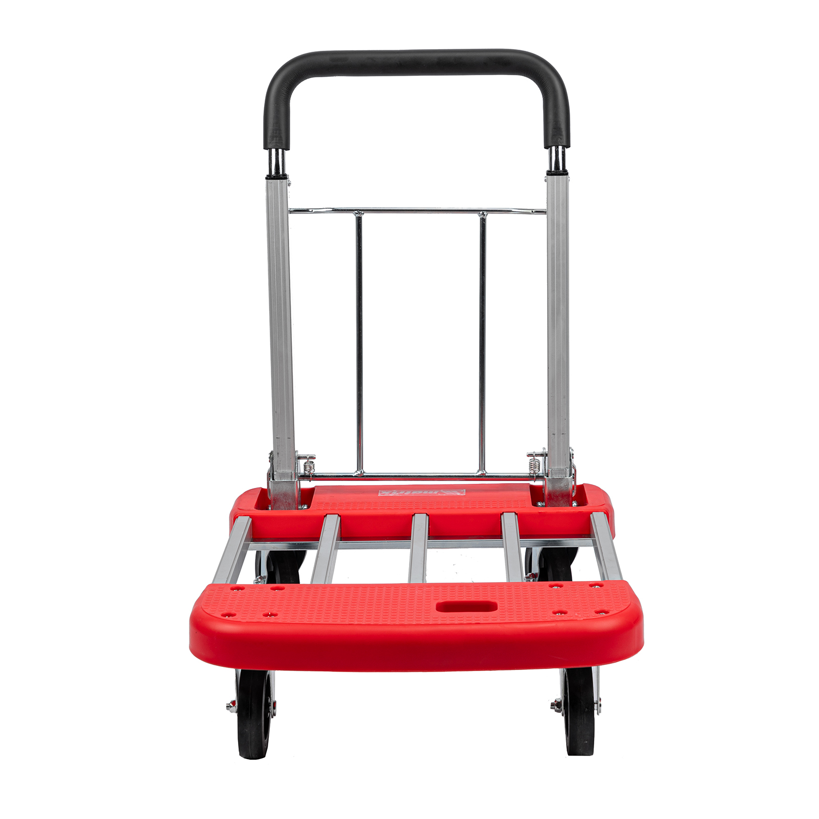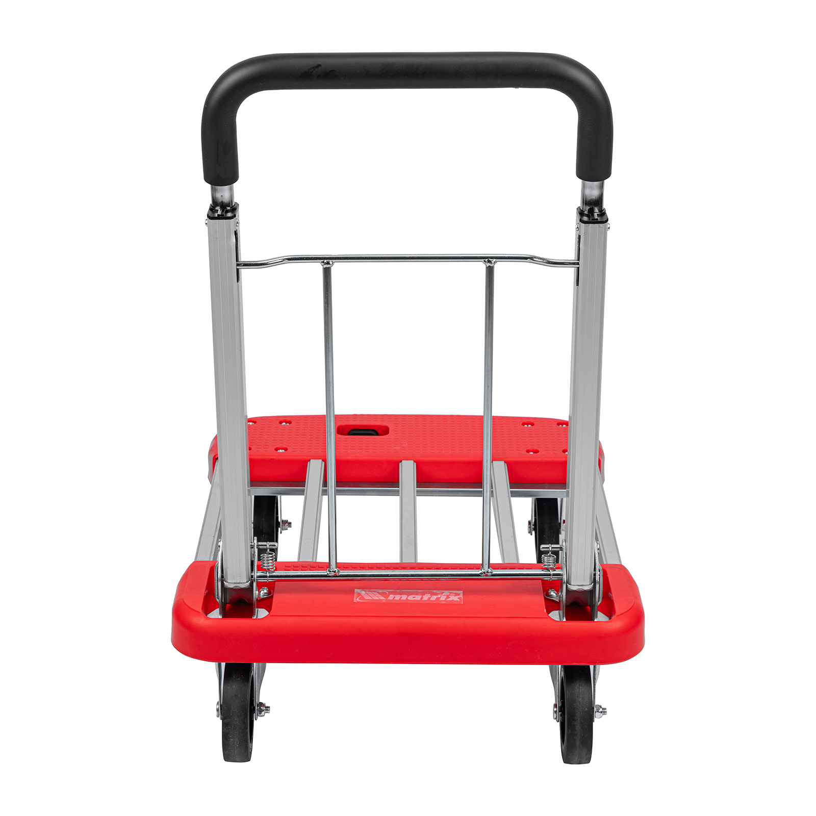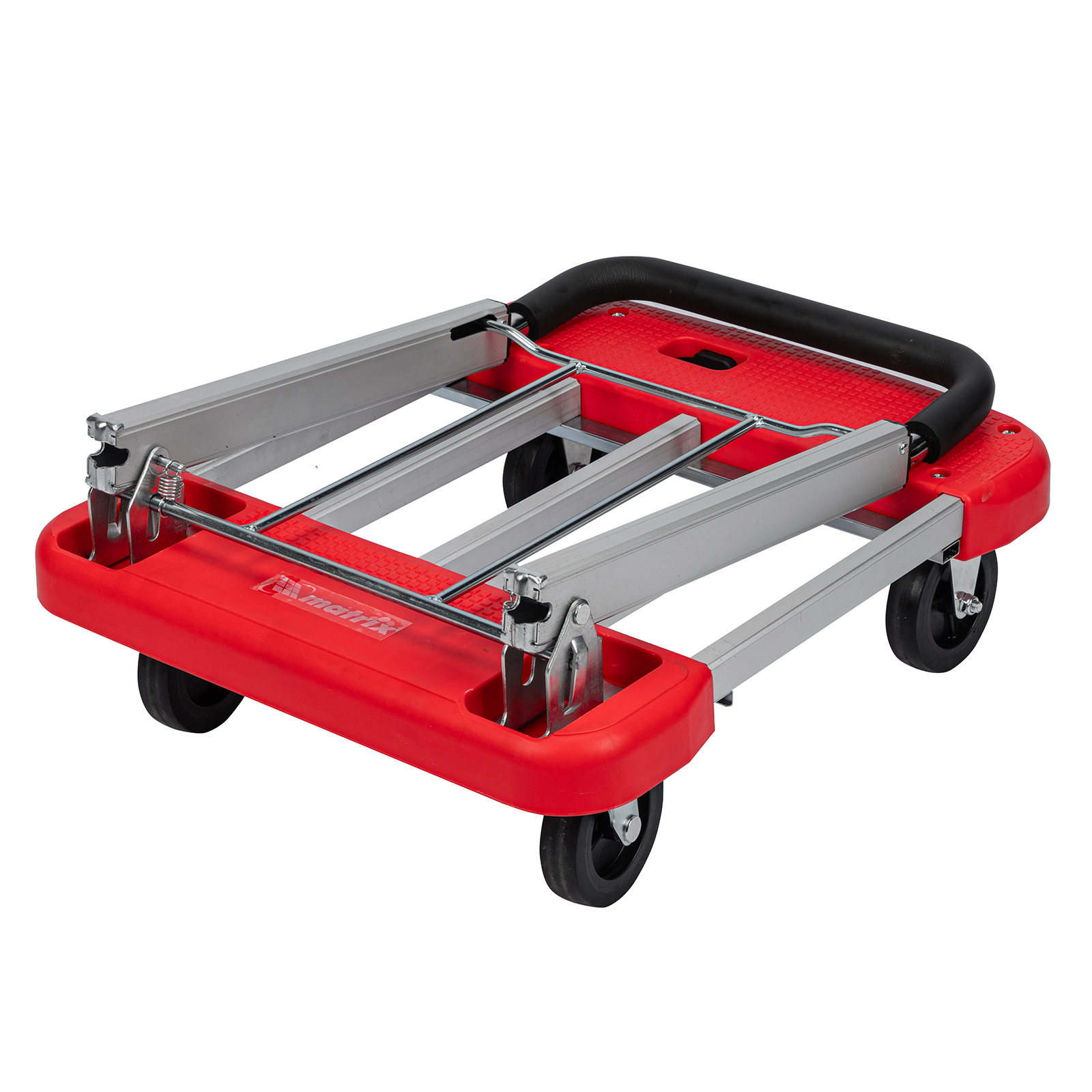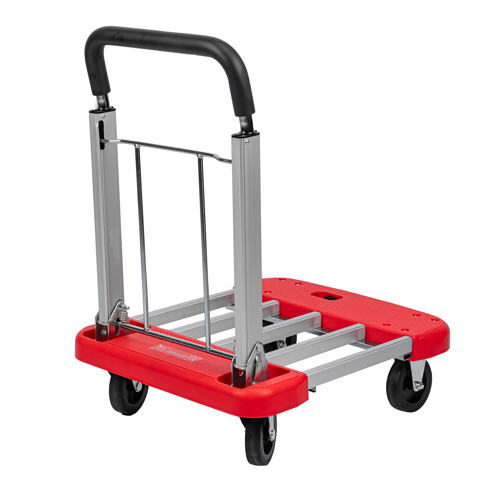 Хозяйственная тележка Matrix 98210 с телескопическими рукояткой и платформой позволяет перемещать грузы массой до 150 кг. Для размещения груза предусмотрена платформа шириной 445 мм. Благодаря раздвижной конструкции длину платформы можно регулировать от 600 до 750 мм в зависимости от габаритов груза.