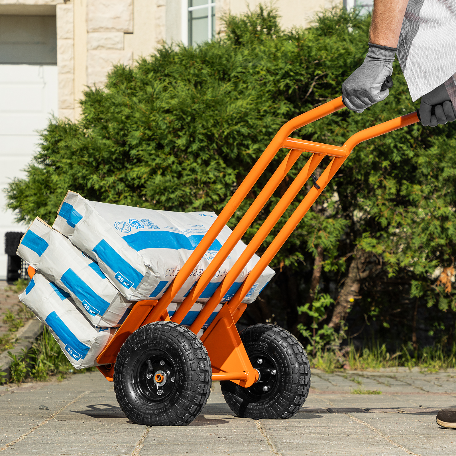 - Удобная транспортировка груза — пневматические колеса с камерами, резиновыми шинами и 2 шарикоподшипниками в каждом гасят вибрации и обеспечивают плавный ход.