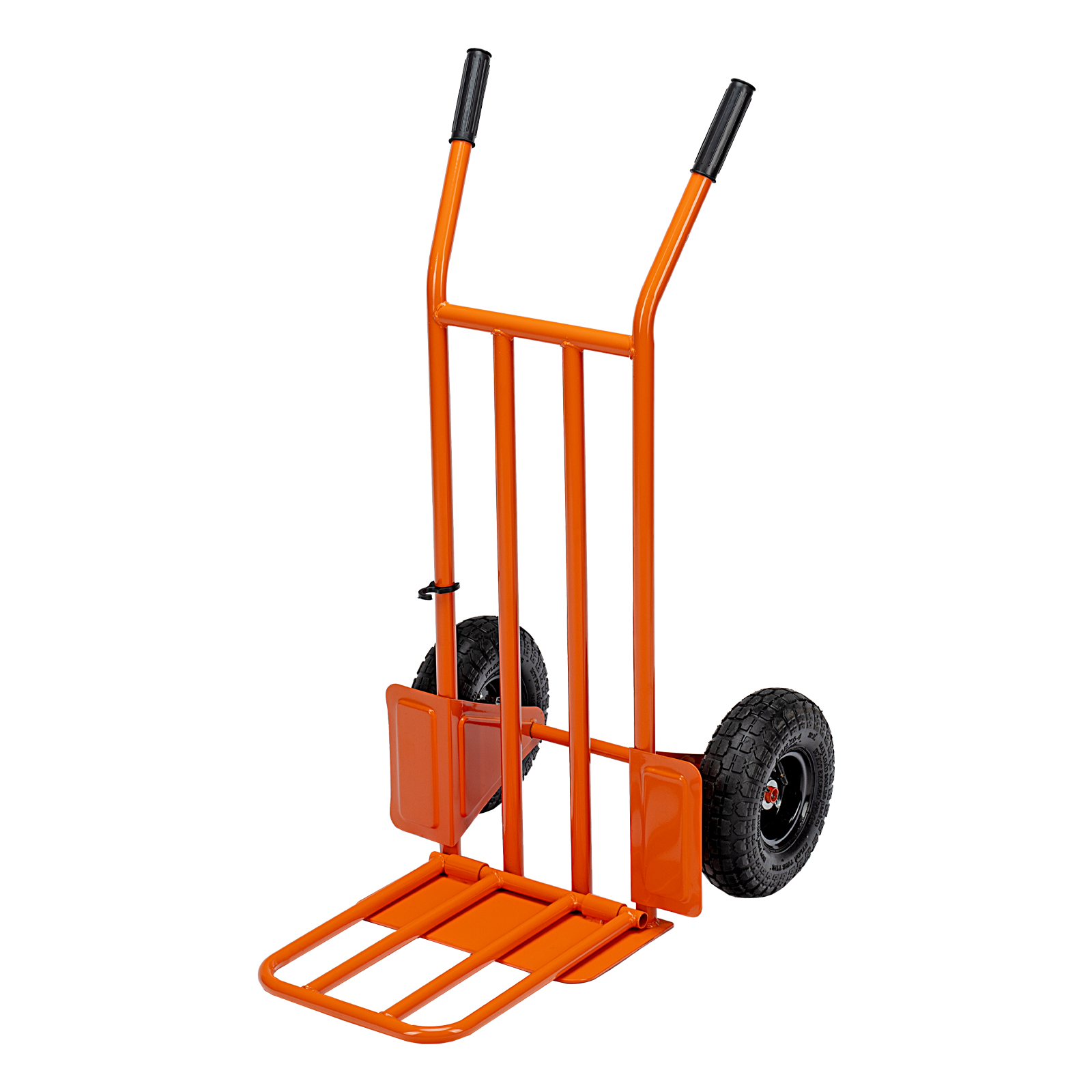 Ручная облегченная двухколесная тележка Сибртех 69301 с пневматическими колесами диаметром 260 мм и откидной платформой размером 430 х 355 мм предназначена для перемещения крупных грузов массой до 150 кг. Пригодится на складе и на производстве.
