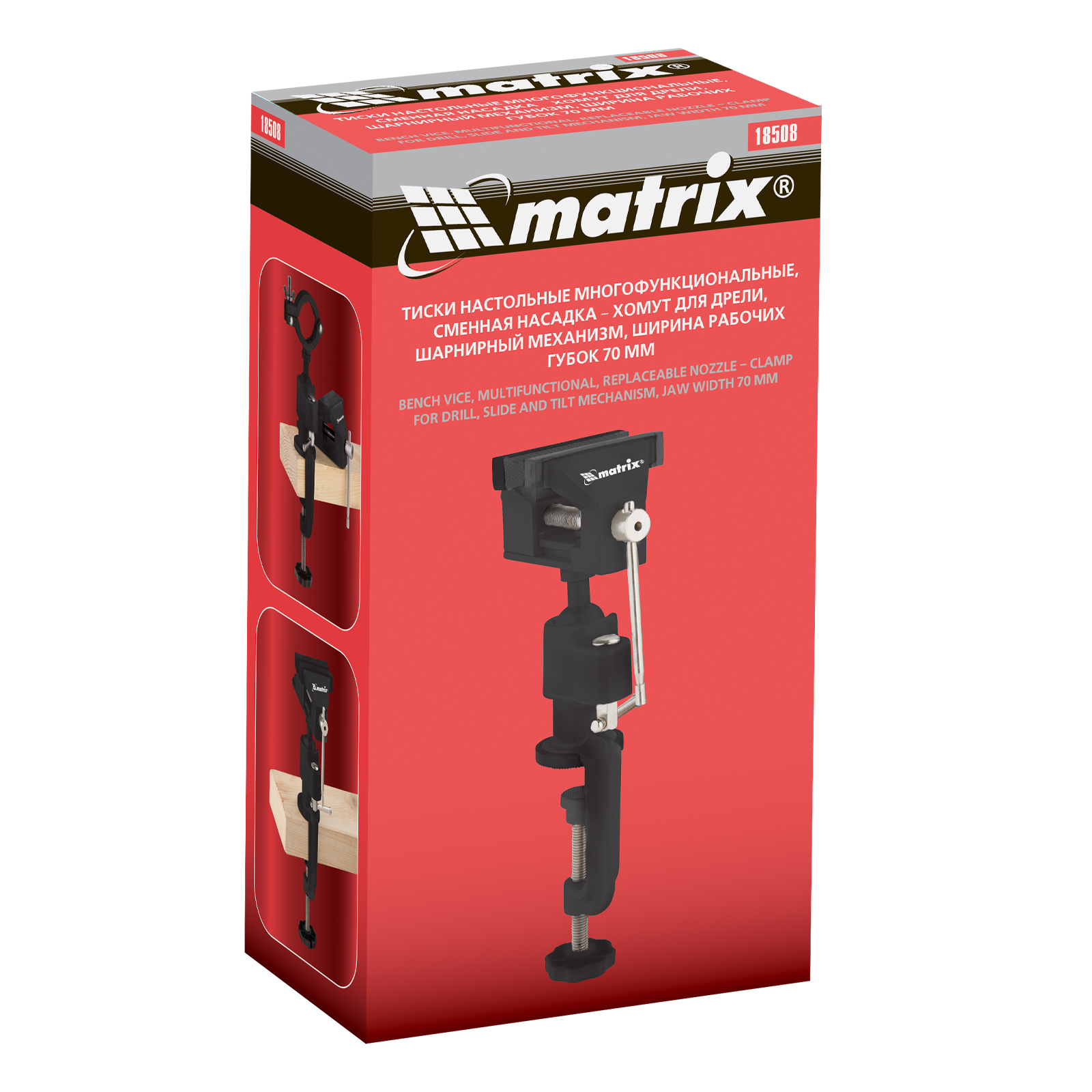 Тиски настольные, многофункциональные, сменная насадка, хомут для дрели, шарнирный механизм, 70 мм Matrix |