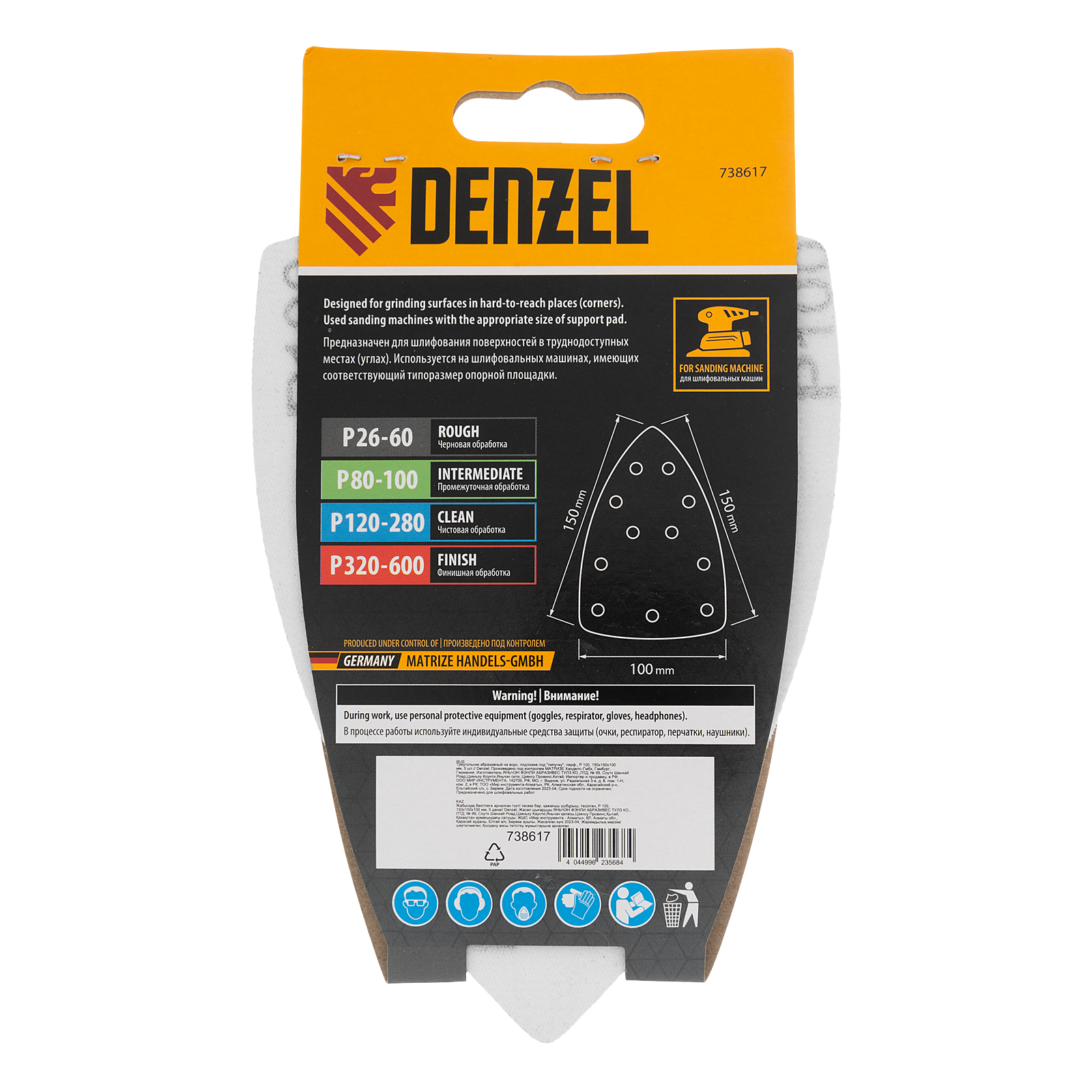Абразивный перфорированный треугольник на ворсовой подложке «под липучку» Denzel 738617 размером 150 х 150 х 100 мм, 5 шт. в упаковке, имеет зернистость P 100 и предназначен для промежуточной обработки металлических, деревянных и других поверхностей. Позволяет удалять заусенцы, старые лакокрасочные покрытия и ржавчину, удобен для работы в углах и других труднодоступных местах. Треугольник совместим с плоскошлифовальной машиной Denzel 27614, также подходит для установки на другие шлифмашины с размером рабочей платформы 150 х 150 х 100 мм.