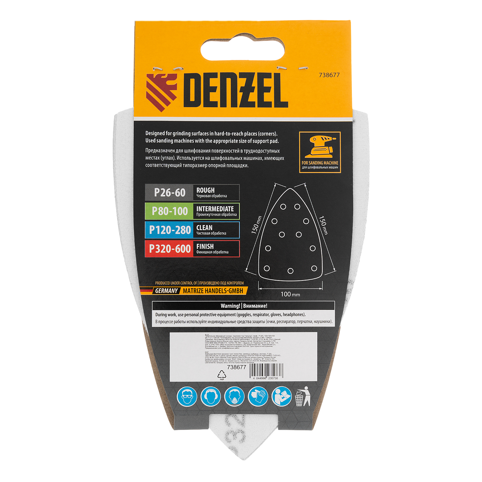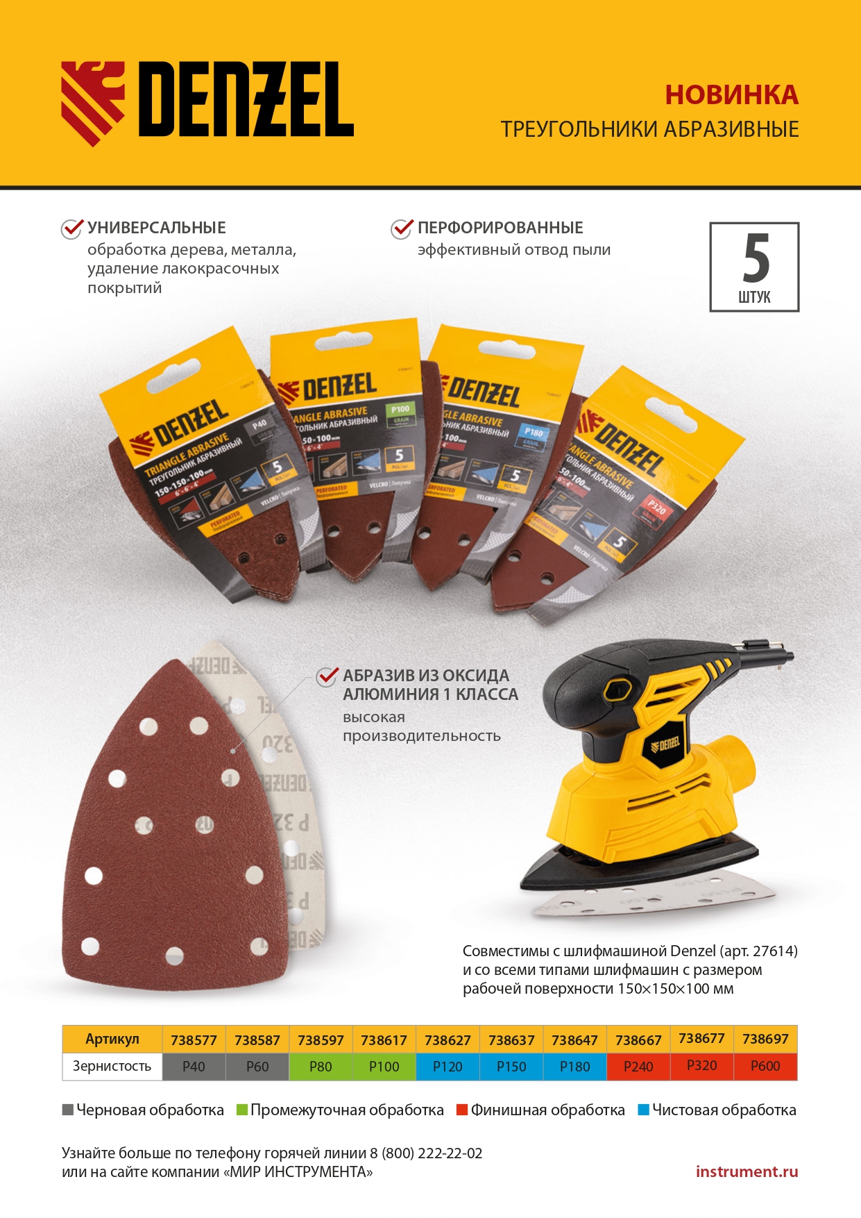 Абразивный перфорированный треугольник на ворсовой подложке «под липучку» Denzel 738677 размером 150 х 150 х 100 мм, 5 шт. в упаковке, имеет зернистость P 320 и предназначен для финишной обработки металлических, деревянных и других деталей. Позволяет устранять с поверхности мельчайшие шероховатости, удобен для работы в углах и других труднодоступных местах. Треугольник совместим с плоскошлифовальной машиной Denzel 27614, также подходит для установки на другие шлифмашины с размером рабочей платформы 150 х 150 х 100 мм.