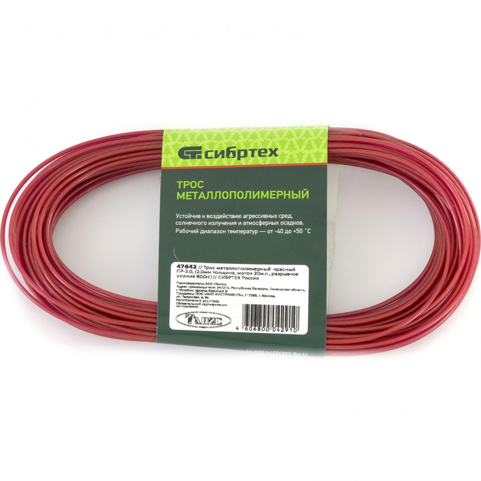 Трос металлополимерный красный ПР-2.0, толщина 2.0 мм, моток 20 метров Сибртех