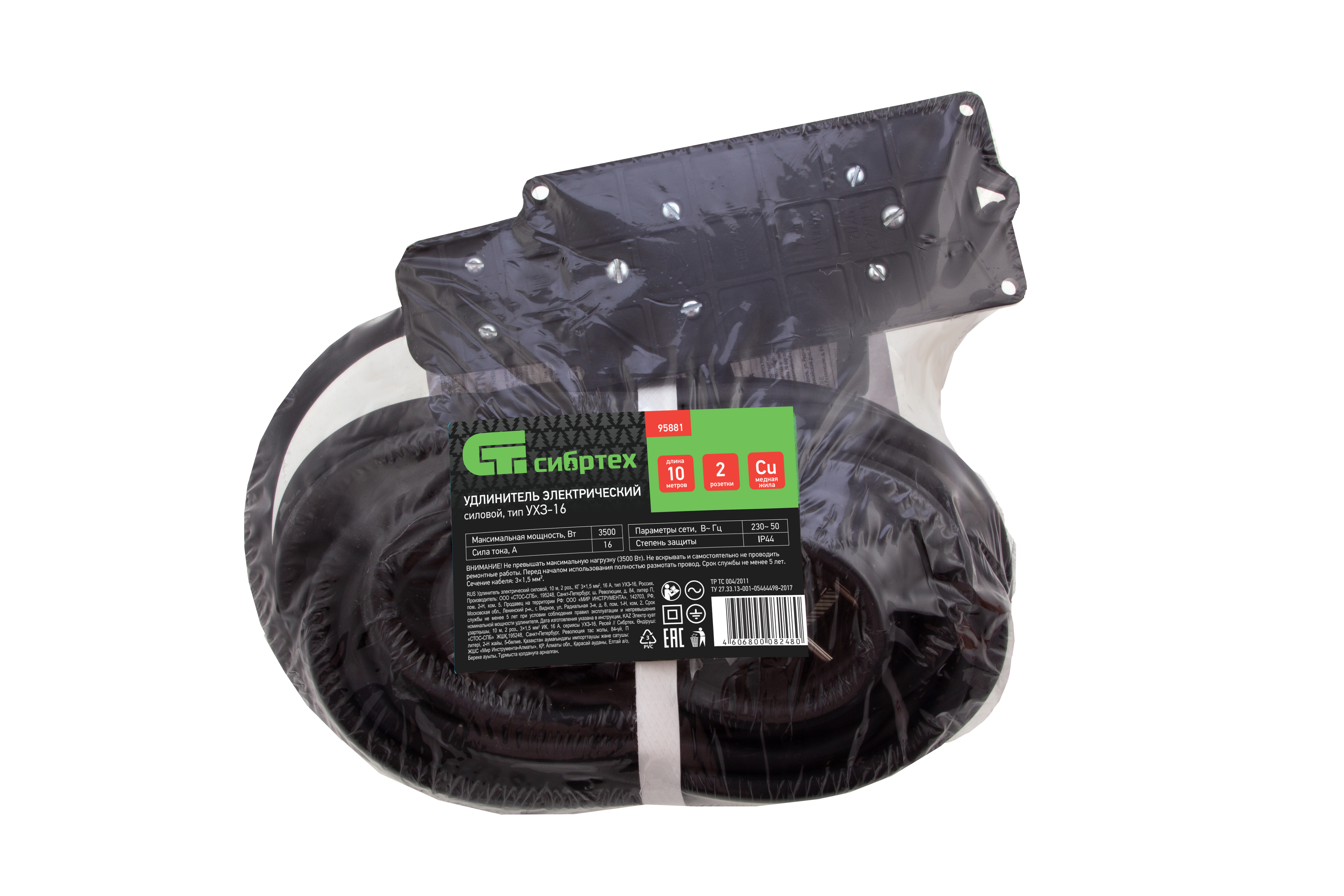 Силовой удлинитель Сибртех 95881, тип УХЗ-16, 16 А, тип кабеля КГ 3 х 1,5 мм, с 2 розетками, позволяет подключать электрооборудование к сети на расстоянии до 10 м от стационарного источника электроснабжения. Медножильный кабель выдерживает нагрузку до 3500 Вт и рассчитан на длительное использование. Розетки закрываются защитными крышками, предотвращающей попадание грязи и влаги на разъемы. Сетевой удлинитель используется в строительстве и на производстве.