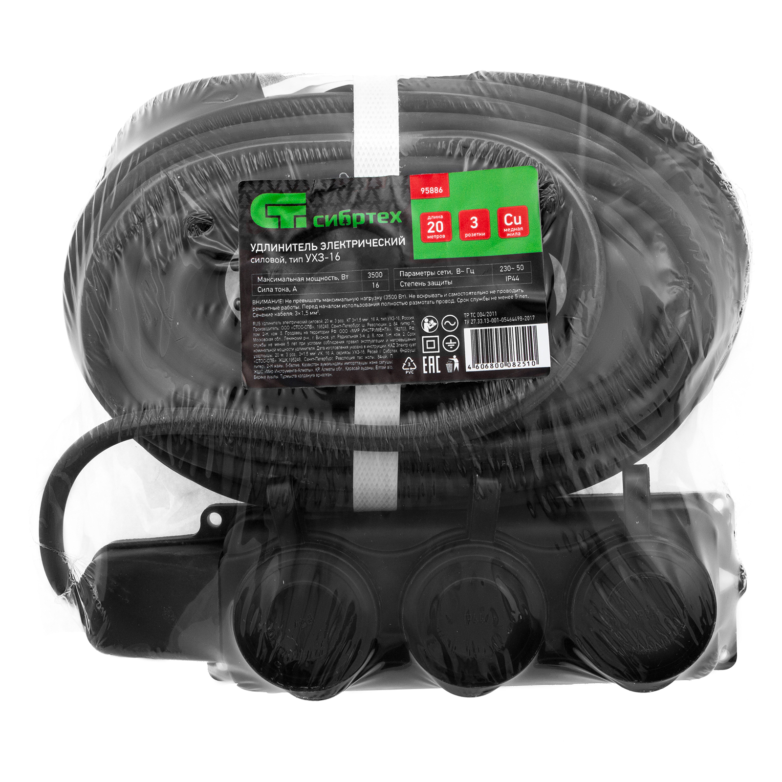 Электрический силовой удлинитель Сибртех 95886, тип УХ3-16, с 3 розетками, с кабелем КГ с 3 жилами сечением 1,5 мм2, рассчитан на силу тока 16 А и позволяет обеспечить электропитание до 3 приборов суммарной мощностью до 3500 Вт на расстоянии до 20 м от стационарного источника. Предназначен для профессионального использования, будет полезен на строительной площадке и производственном предприятии.