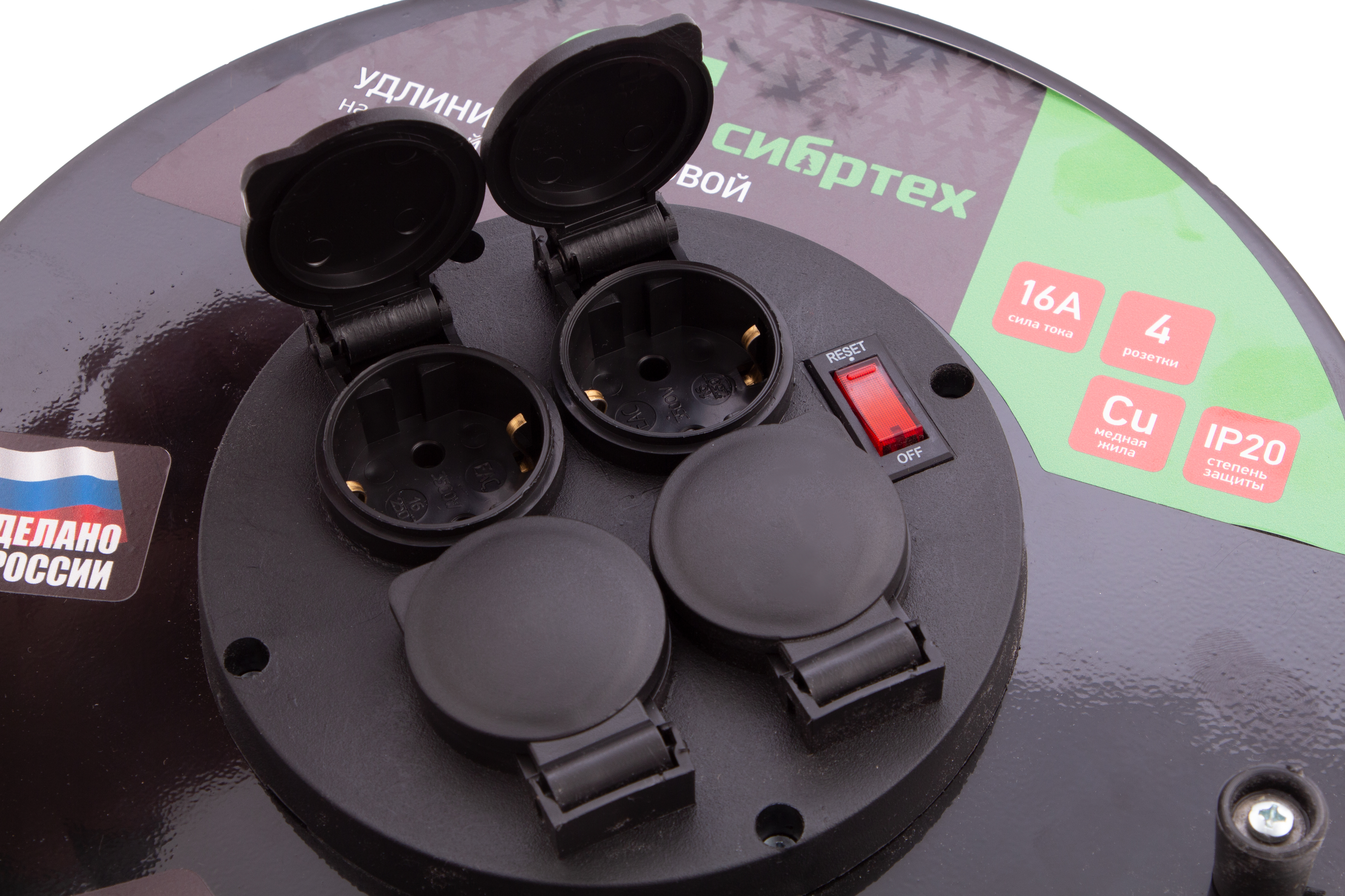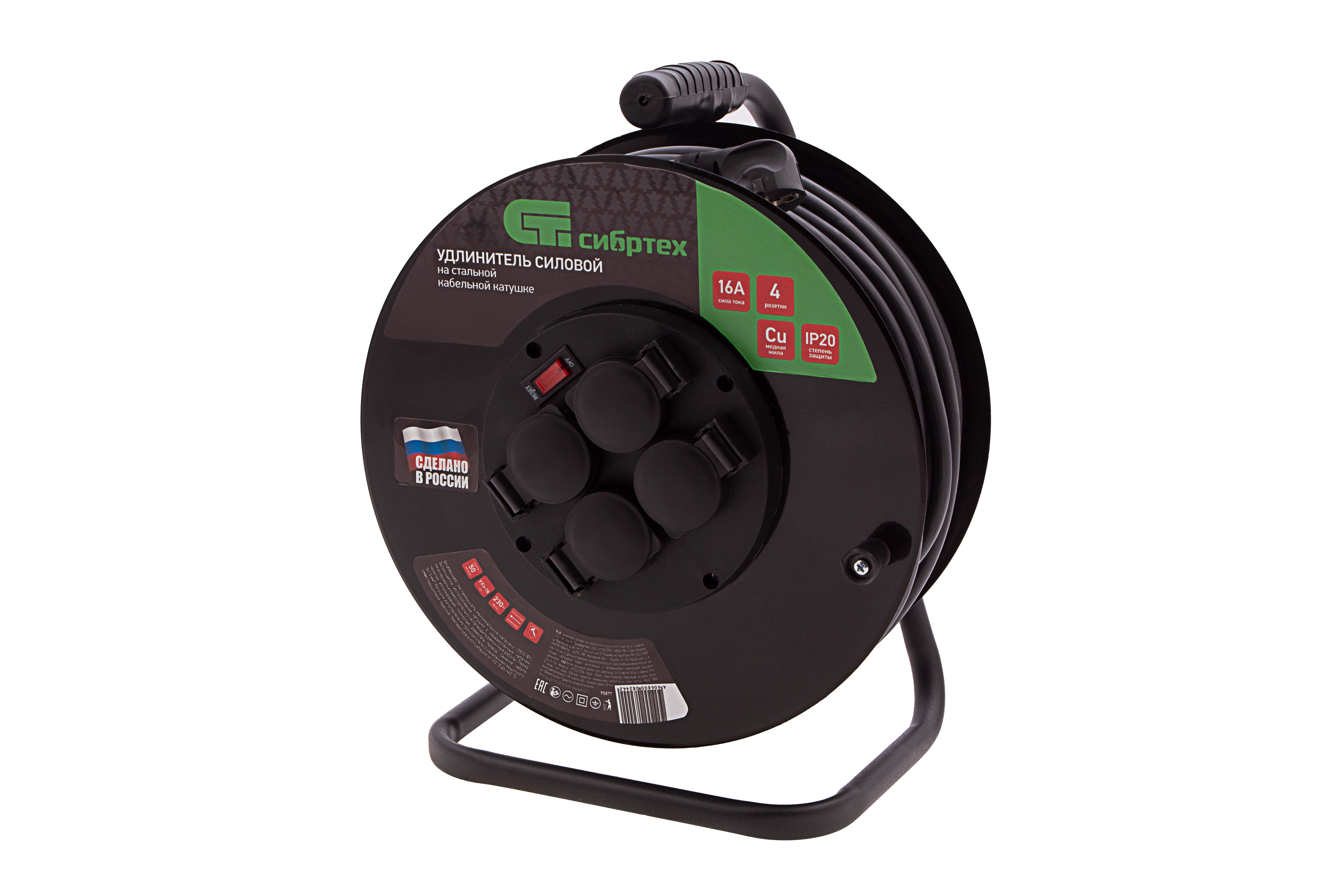 Удлинитель силовой 50 м, 16А, тип УХз16, КГ 3 x 1.5 мм, на стальной катушке, 4 розетки Сибртех