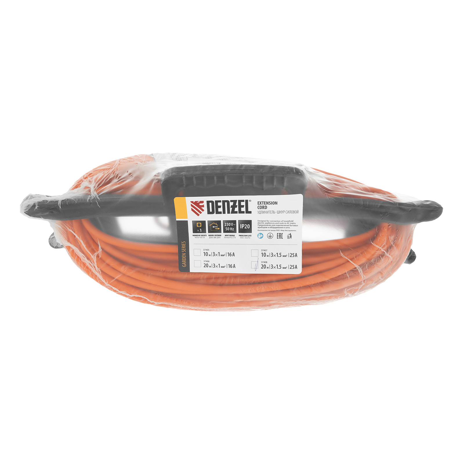 Силовой удлинитель-шнур Denzel Garden Series 37408 с кабелем ПВС сечением 3 x 1,5 мм и 1 розеткой, позволяет подключать приборы к электросети на расстоянии до 20 м от стационарного источника питания. Максимальная мощность потребителя составляет 4400 Вт при полностью размотанном кабеле и 2200 Вт — при смотанном. Удлинитель может использоваться при температуре от +5 до +35 °C. Пригодится дома, на даче, в гараже.