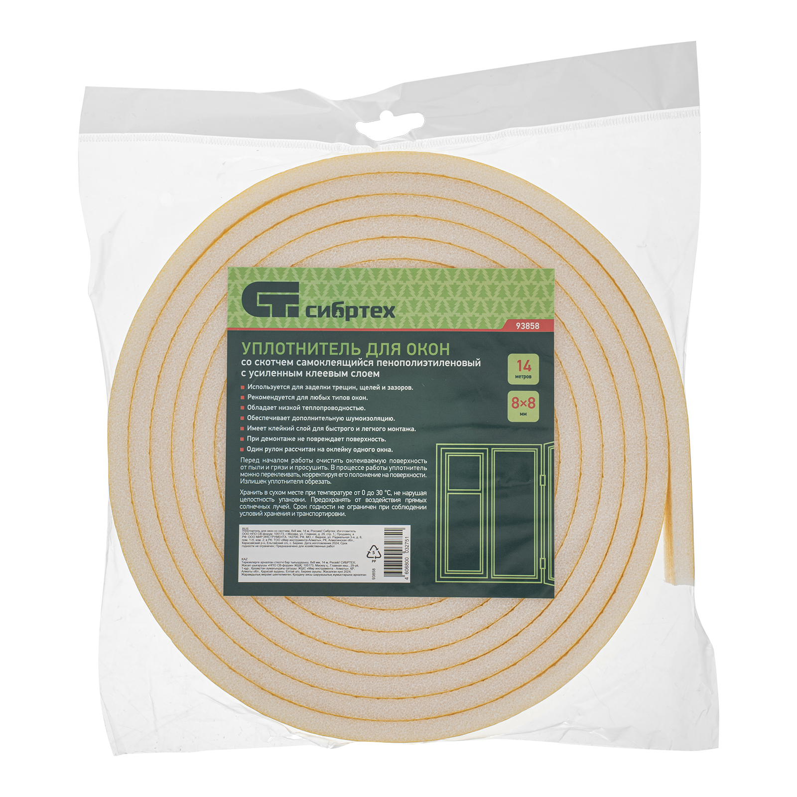Уплотнитель для окон Сибртех 93858 со скотчем, сечением 8 х 8 мм и длиной 14 м используется для теплоизоляции жилых помещений, магазинов, складов и т.д. Изделие также обеспечивает звукоизоляцию, препятствует попаданию пыли, образованию сквозняков, благодаря чему в помещении формируется комфортный микроклимат.