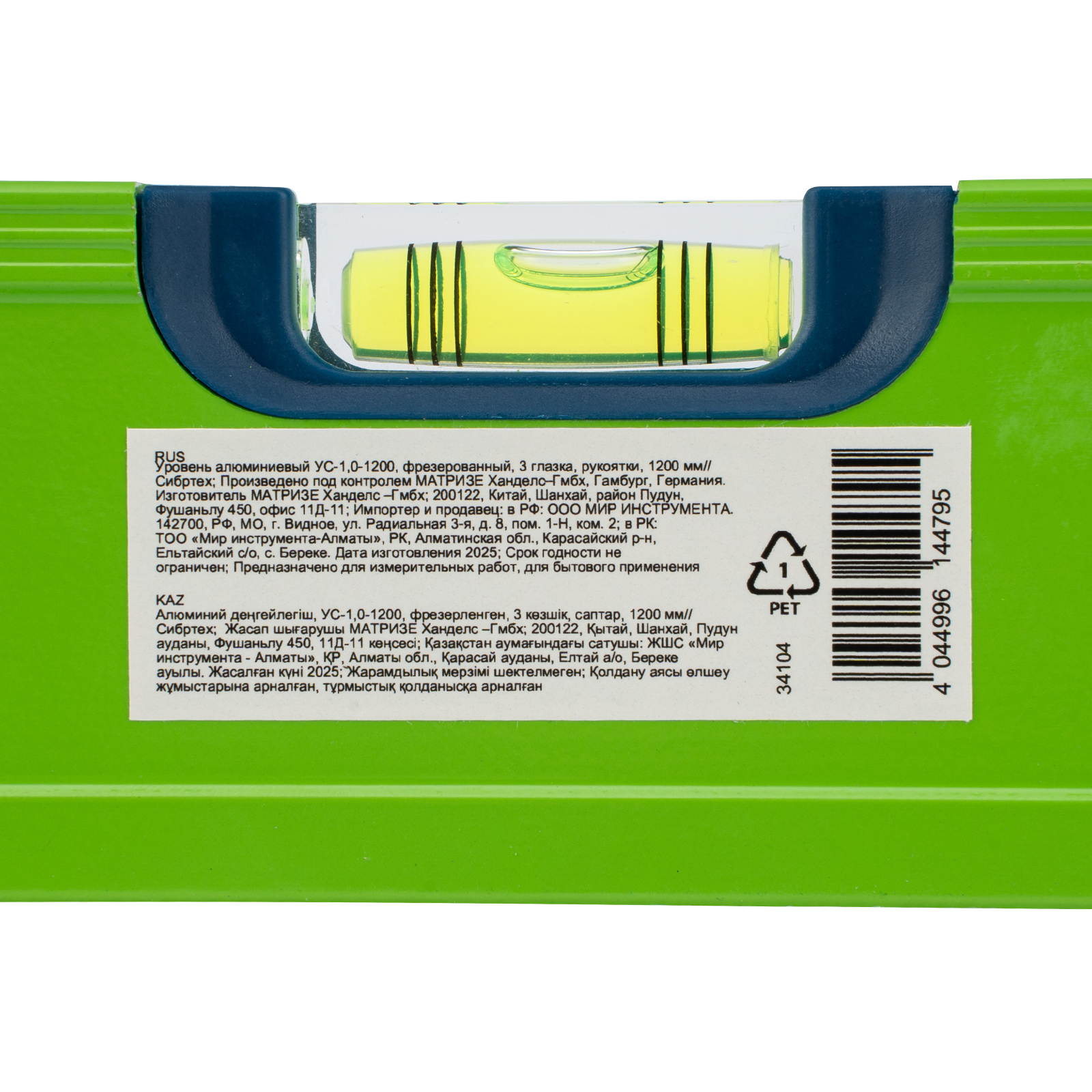 Уровень алюминиевый УС-1, 0-1200, фрезерованный, 3 глазка, рукоятки, 1200 мм Сибртех