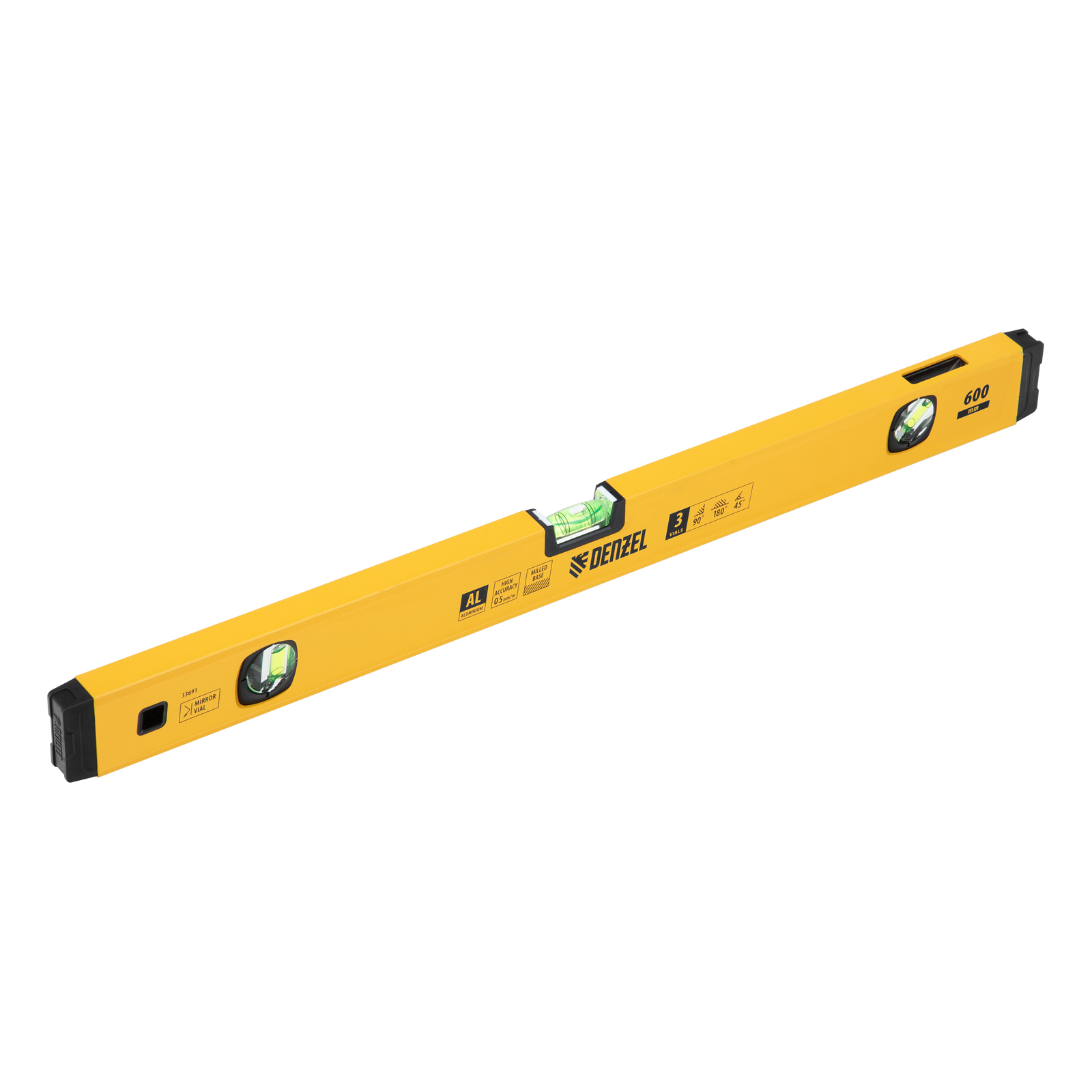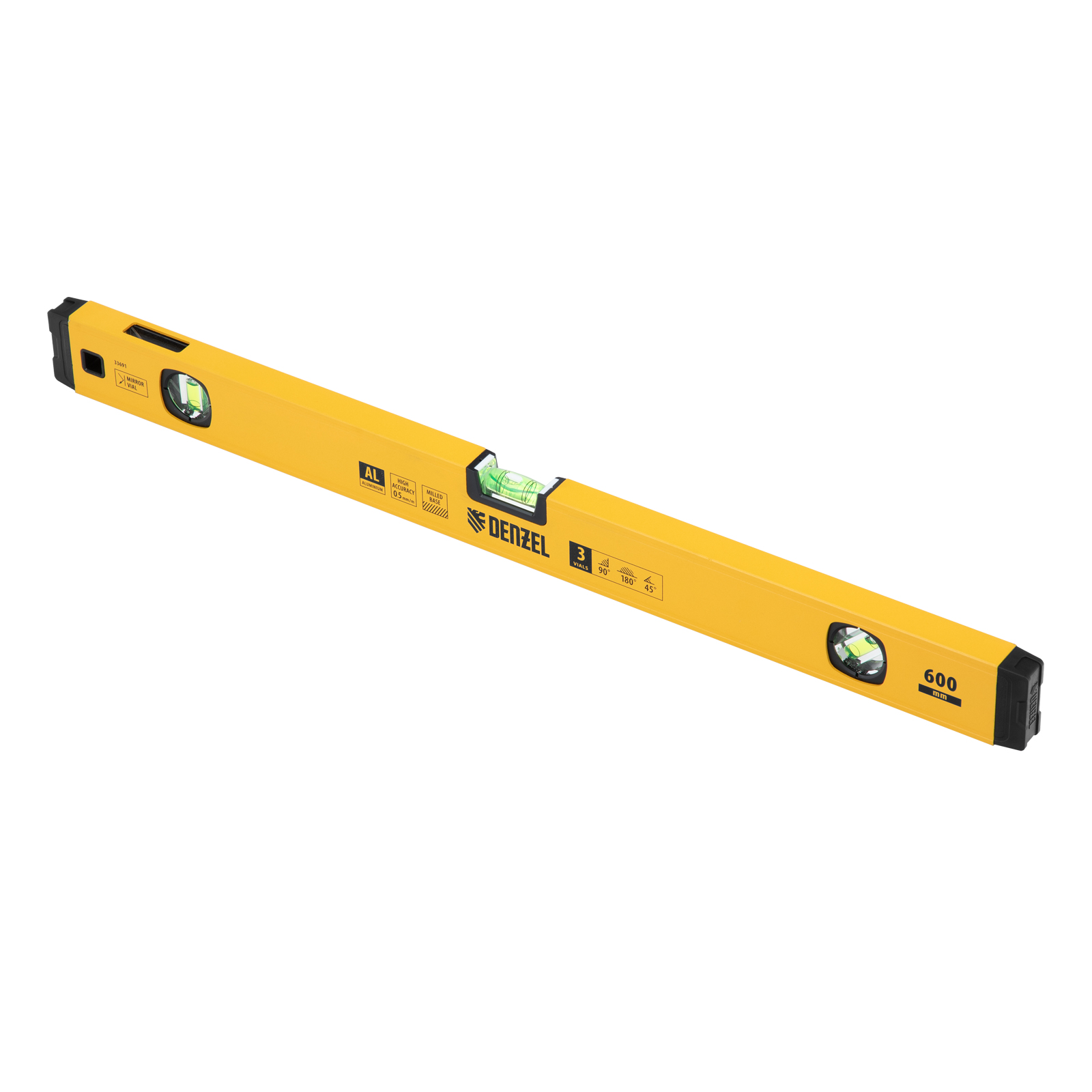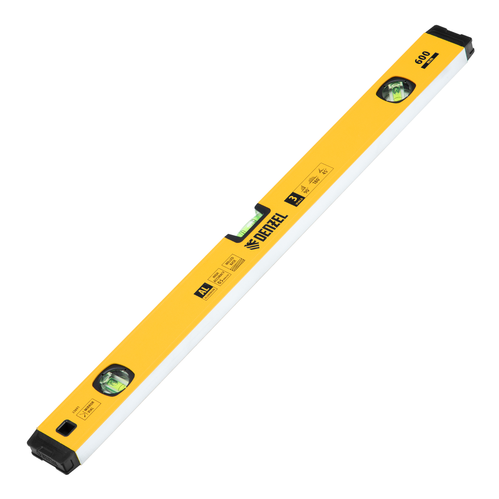 Уровень алюминиевый, магнит, фрезерованный, 3 глазка (1 зеркал.) 0,5 мм/м, 600 мм Denzel
