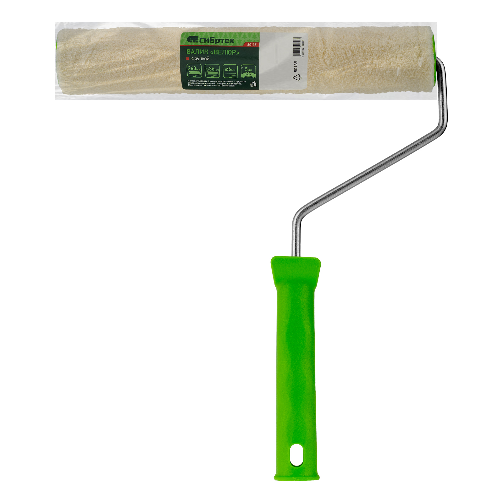 Валик "Велюр" с ручкой, 240 мм, ворс 5 мм, D 36 мм, D ручки 6 мм Сибртех