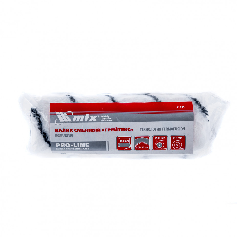 Сменный валик MTX PRO LINE «ГРЕЙТЕКС» 81335 с ворсом из полиакрила 12 мм, диаметром ролика 40 мм и шириной 180 мм, устанавливается на ручку 6 мм. Валиком удобно обрабатывать участки значительной площади, поэтому он используется для подготовки больших поверхностей под покраску, а также для окрашивания стен и потолков. Ворс 12 мм позволяет качественно окрашивать среднешероховатые поверхности.