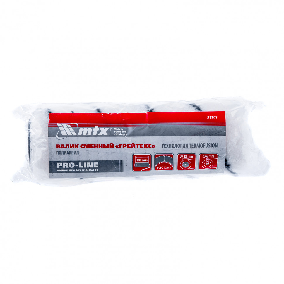Сменный валик MTX PRO LINE «ГРЕЙТЕКС» 81307 с ворсом из полиакрила 12 мм, диаметром ролика 48 мм и шириной 180 мм, устанавливается на ручку 6 мм. Валиком удобно обрабатывать участки значительной площади, поэтому он используется для подготовки больших поверхностей под покраску, а также для окрашивания стен и потолков. Ворс 12 мм позволяет качественно окрашивать среднешероховатые поверхности.