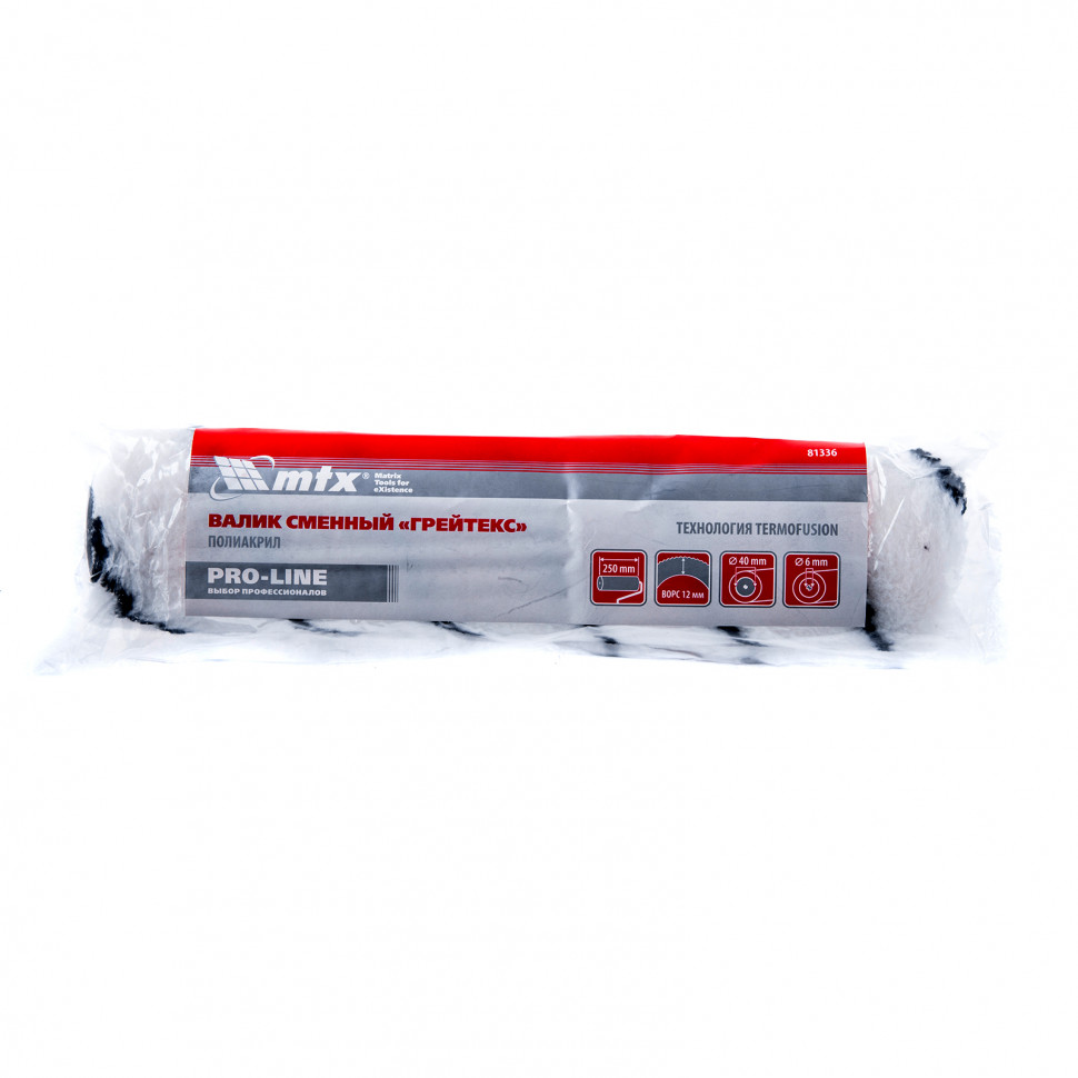 Сменный валик MTX PRO LINE «ГРЕЙТЕКС» 81336 с ворсом из полиакрила 12 мм, диаметром ролика 40 мм и шириной 250 мм, устанавливается на ручку 6 мм. Валиком удобно обрабатывать участки значительной площади, поэтому он используется для подготовки больших поверхностей под покраску, а также для окрашивания стен и потолков. Ворс 12 мм позволяет качественно окрашивать среднешероховатые поверхности.