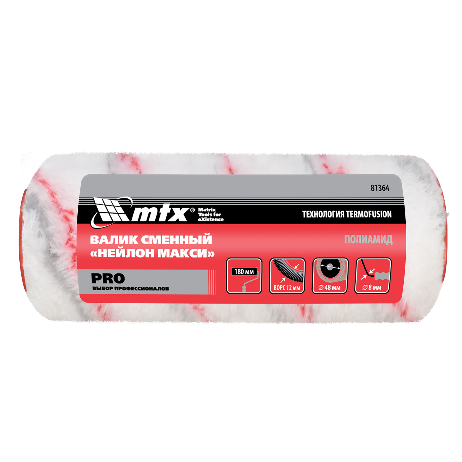 Сменный валик MTX PRO «НЕЙЛОН МАКСИ» 81364 с ворсом 12 мм, шириной 180 мм, диаметром ролика 48 мм, устанавливается на бюгель диаметром 8 мм и используется для окрашивания гладких и шероховатых поверхностей. Ширина валика позволяет быстро обрабатывать участки большого размера. ,Валики из полиамида предназначены для нанесения всех видов красок: на водно-дисперсионной основе и основах, содержащих растворители. Этот материал хорошо впитывает и отдает краску. Он легко чистится, не требует специального ухода, устойчив к агрессивным составляющим красящих веществ.