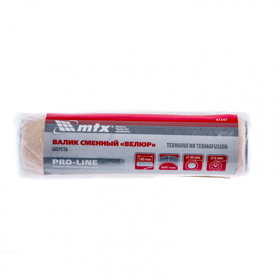 Сменный валик MTX PRO «ВЕЛЮР» 81347 с ворсом 4 мм из шерсти 50% и полиакрила 50%, шириной ролика 180 мм и диаметром 40 мм, устанавливается на бюгель 6 мм. Используется при лакировании полов и гладкой древесины. Коротковорсовая шубка подходит для нанесения финишного покрытия и оптимальна для работы с алкидными и эпоксидными лаками, а также защитными составами на основе растворителей.