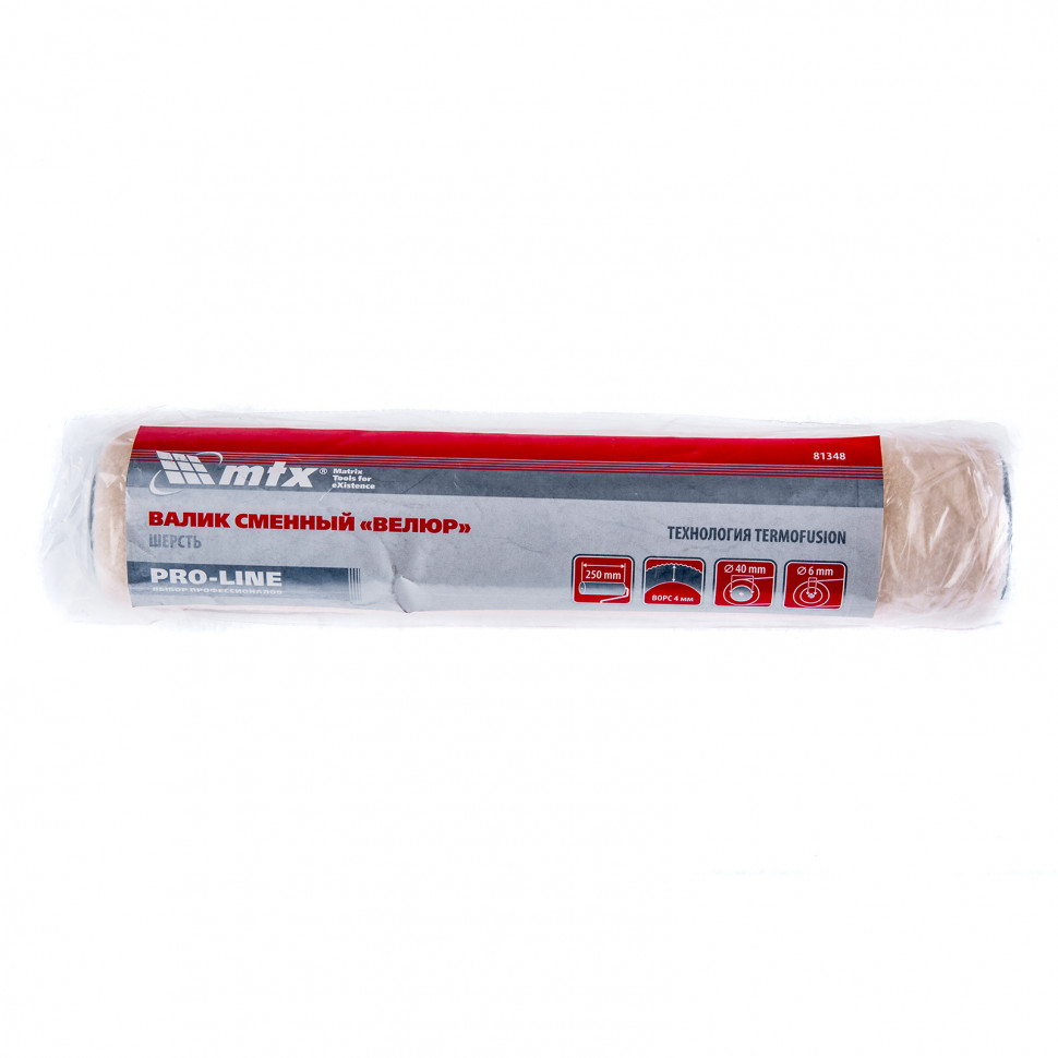 Валик сменный "Велюр" Pro, 250 мм, ворс 4 мм, D 40 мм, D ручки 6 мм, шерсть 50%, полиакрил 50% MTX