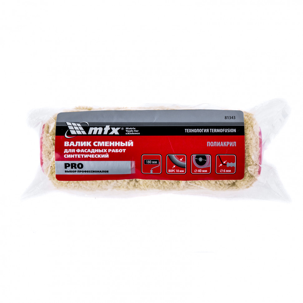 Валик сменный для фасадных работ синтетический Pro, 180 мм, ворс 18 мм, D 40 мм, D ручки 6 мм, полиакрил MTX