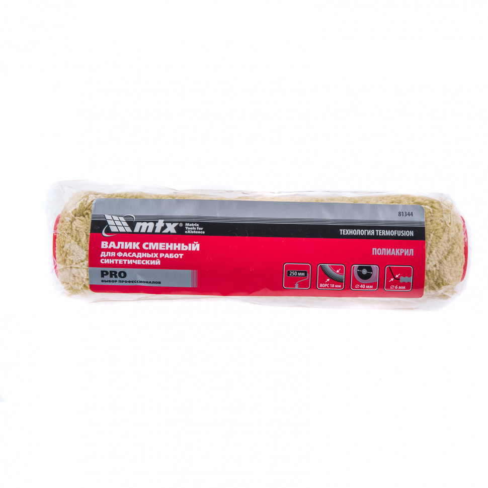 Валик сменный для фасадных работ синтетический Pro, 250 мм, ворс 18 мм, D 40 мм, D ручки 6 мм, полиакрил MTX